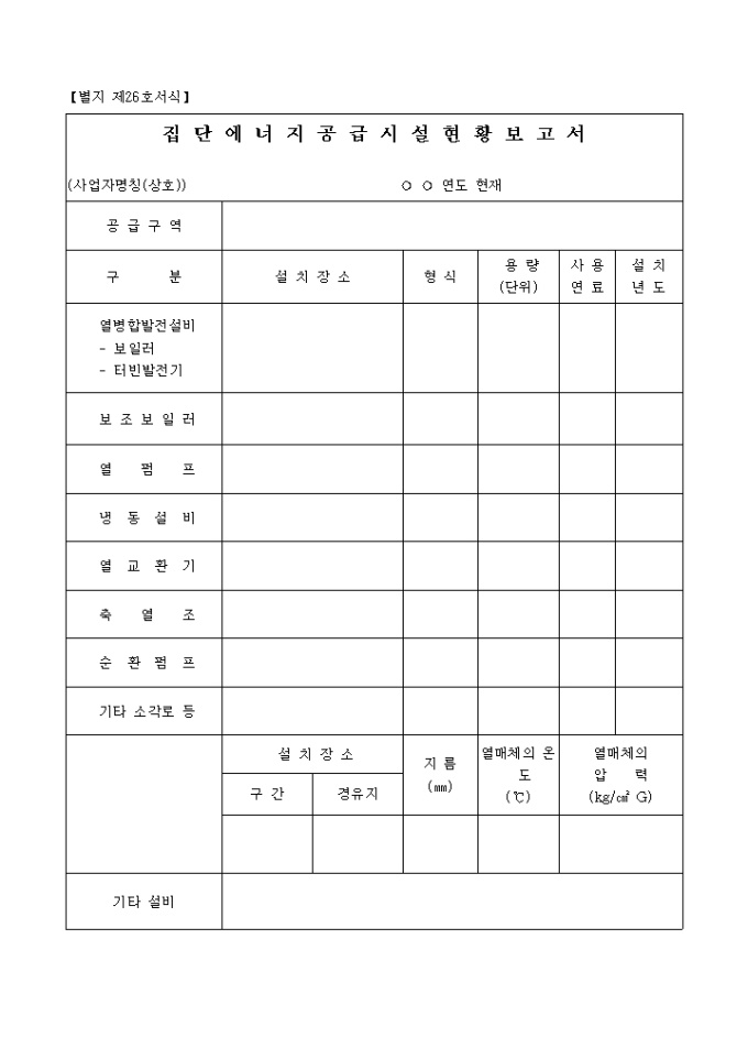 집단 에너지 공급 시설 현황보고서 양식입니다. 공급구역, 구분에 따른 설치 장소, 형식, 용량, 시용연료, 설치 년도 등을 기재합니다.