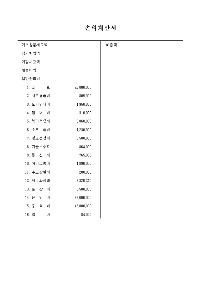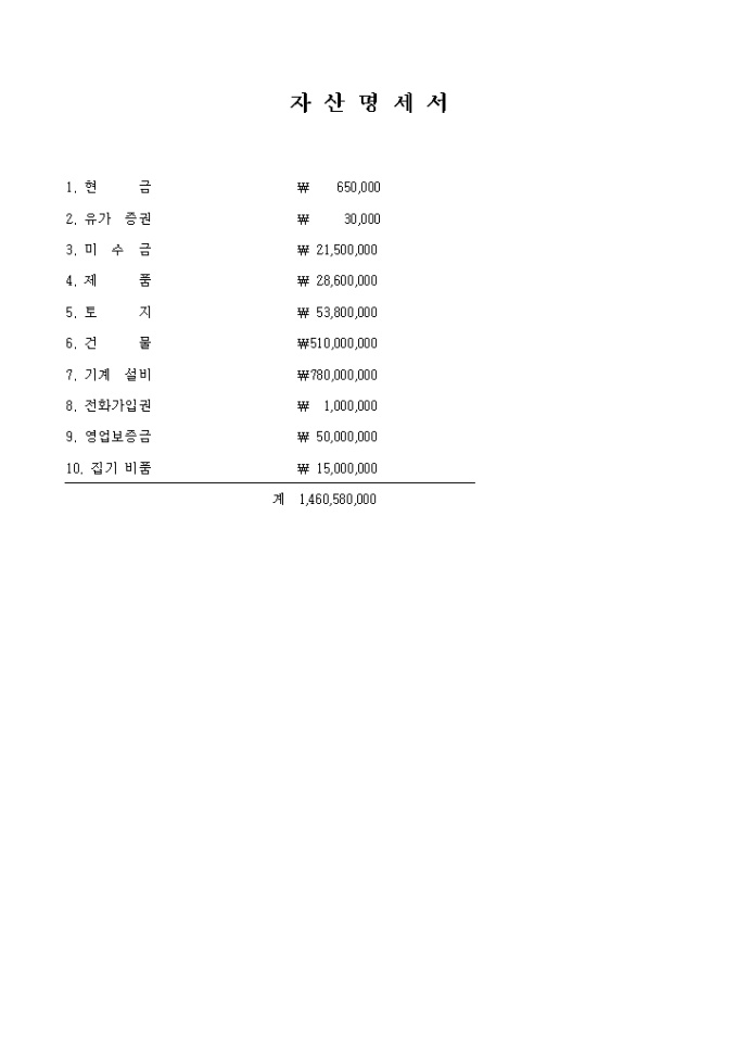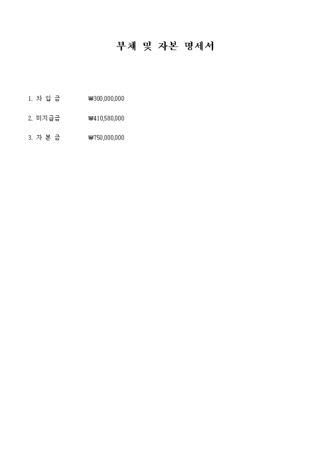 9,000원/월각 항목별 자산 금액 및 부채 금액을 기록하는 자산명세서 (부채 자본 세금 손익계산서) 양식입니다.