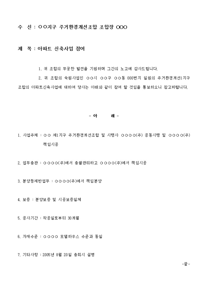 9,000원/월조합의 숙원사업인 ○○시 ○○구 ○○동 000번지 일원의 주거환경개선1지구 조합의 아파트신축사업에 대하여 당사는 참여 할 것임을 통보하는 아파트 신축사업 참여 (주거환경개선) 양식입니다.