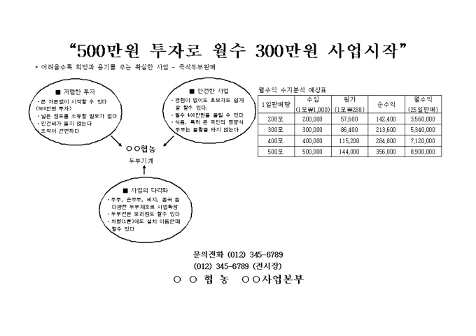 사업투자소개서 (저자금) 저렴한 투자 ·큰 자본없이 시작할 수 있다 (500만원 투자) ·넓은 점포를 소유할 필요가 없다 ·인건비가 들지 않는다 ·조작이 간편하다
