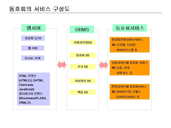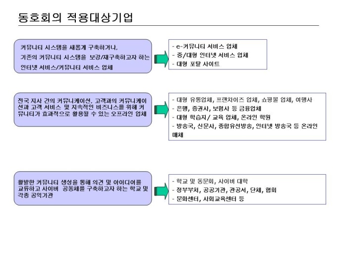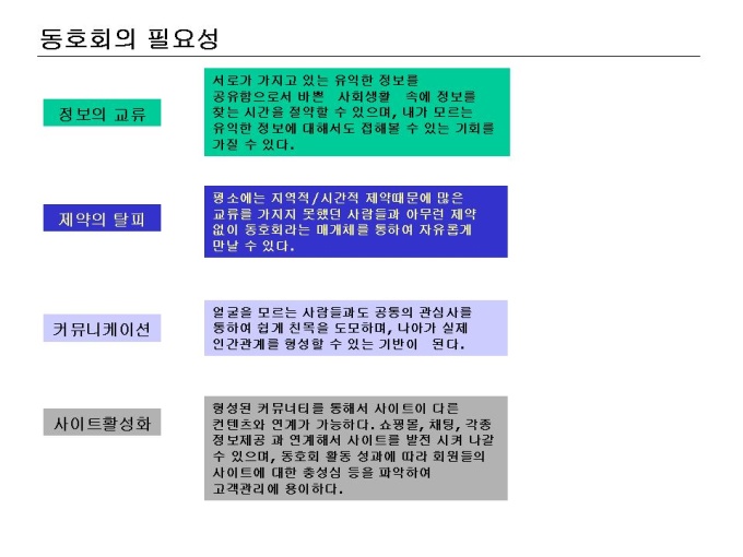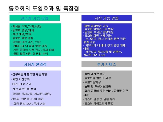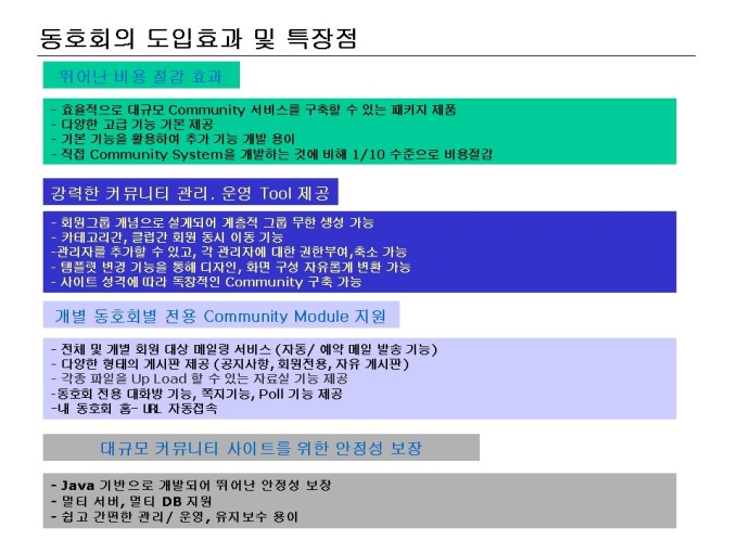 정보의 교류, 제약의 탈피, 커큐니케이션, 사이트활성화, 동호회의 도입효과 및 특장점, 동호회의 적용대상기업, 동호회의 서비스 구성도, 동호회의 Platform, 솔루션 업그레이드 및 A/S, 동호회 문의
