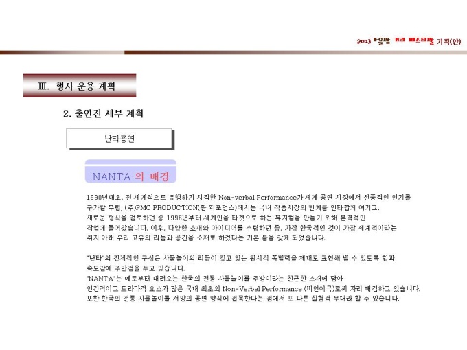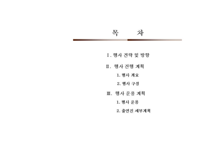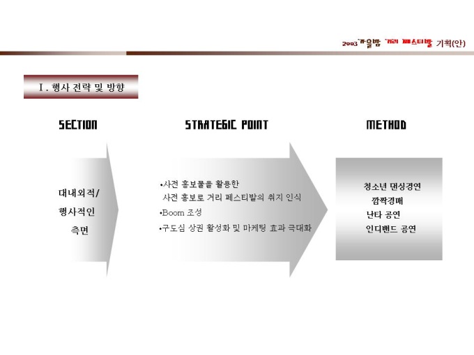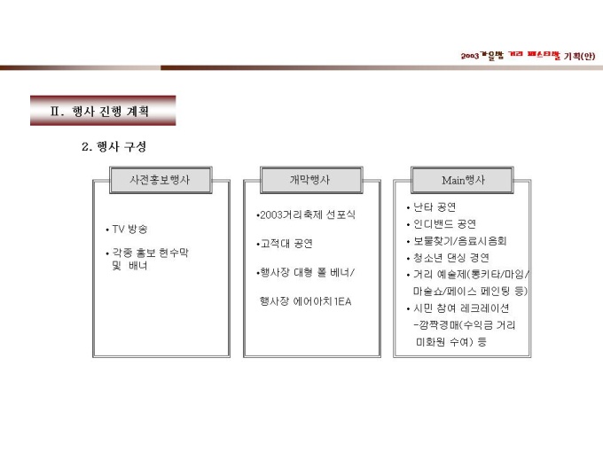 기획서 (페스티발_거리) Ⅰ. 행사 전략 및 방향 Ⅱ. 행사 진행 계획 1. 행사 개요 2. 행사 구성 Ⅲ. 행사 운용 계획 1. 행사 운용 2. 출연진 세부계획