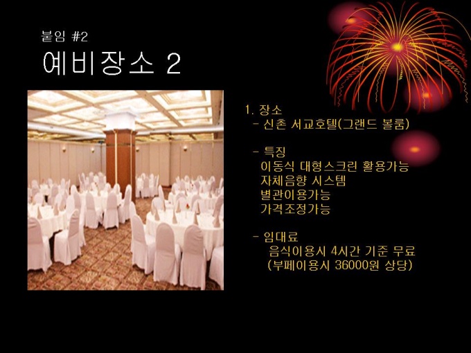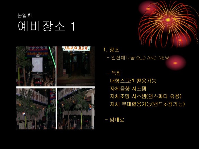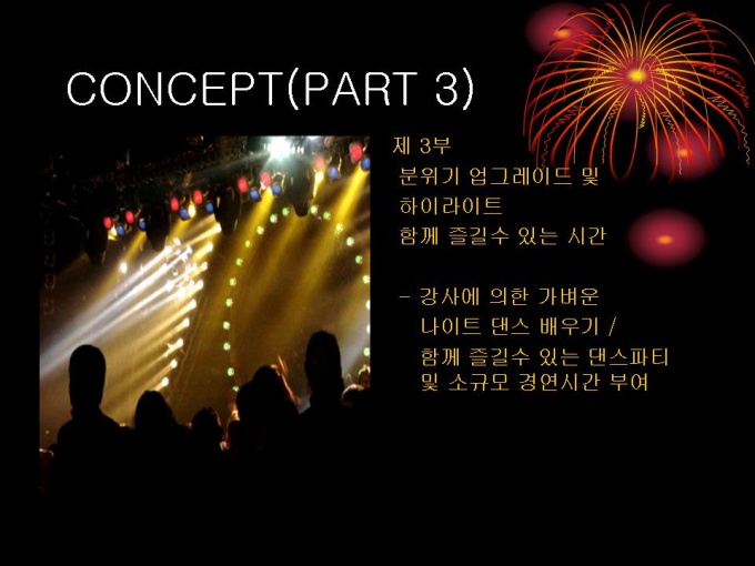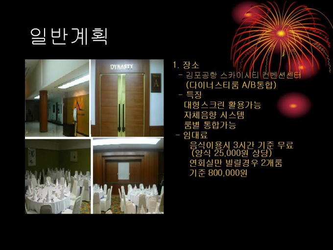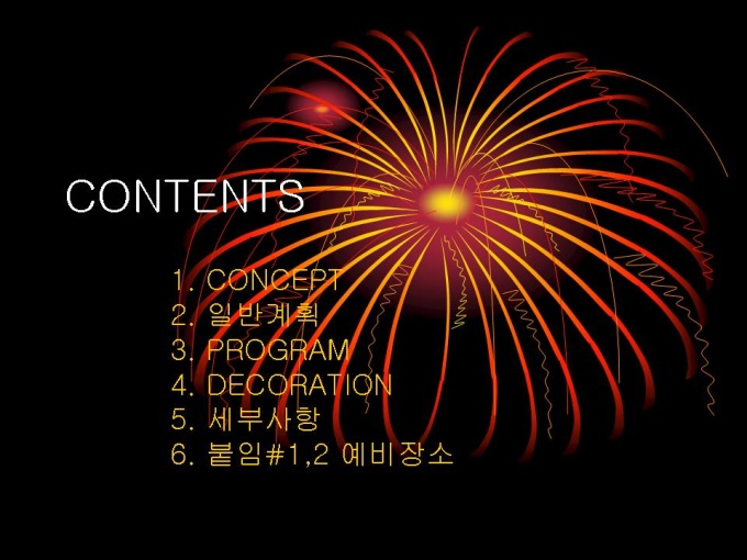 기획서 (페스티발_미팅) 1. CONCEPT 2. 일반계획 3. PROGRAM 4. DECORATION 5. 세부사항 6. 붙임#1,2 예비장소