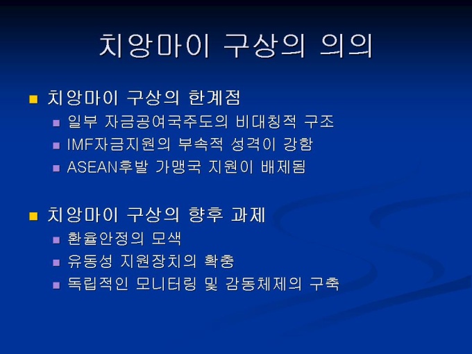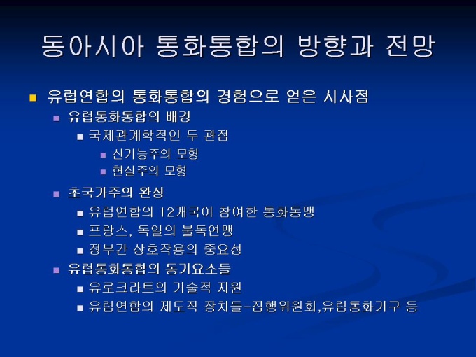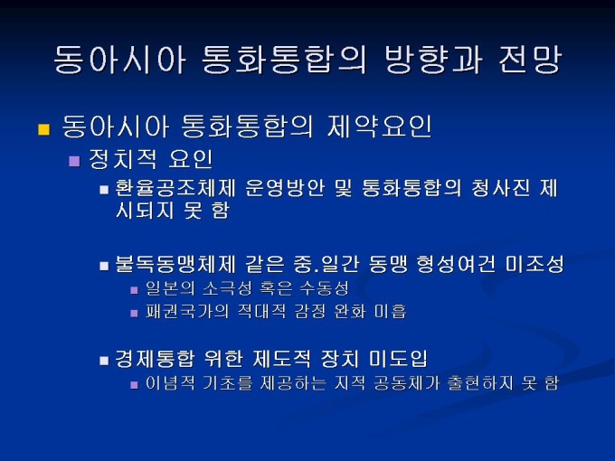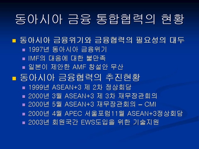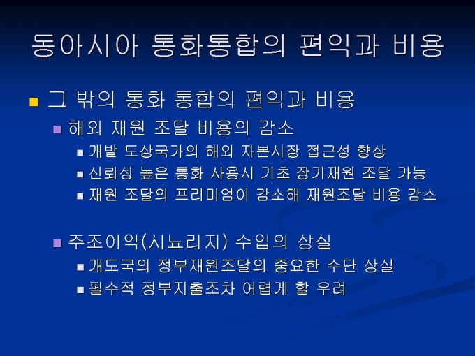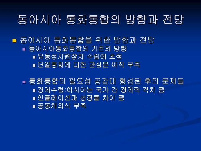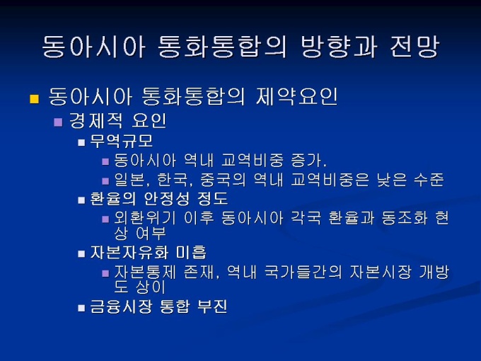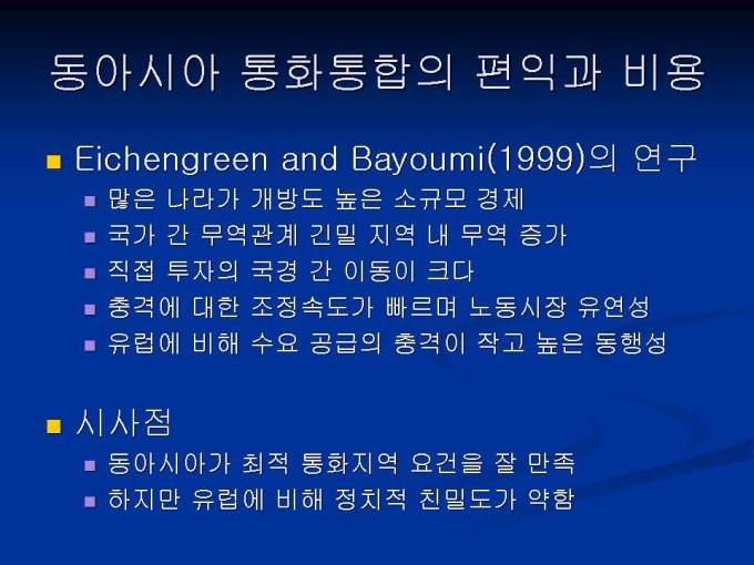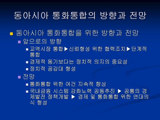 프리젠테이션 자료 (경영_국제경영학1) 통화 통합의 방향과 전망에 관한(동아시아 금융위기와 그에 따른 통화 통합 논의와 전망) 내용입니다.