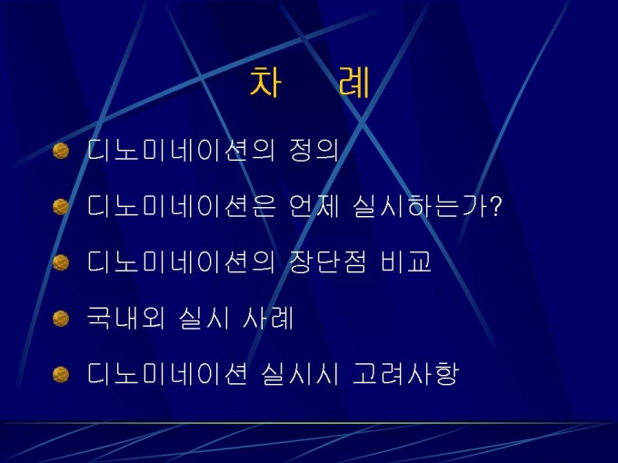 디노미네이션의 정의 디노미네이션은 언제 실시하는가? 디노미네이션의 장단점 비교 국내외 실시 사례 디노미네이션 실시시 고려사항 프리젠테이션 자료 (경제_디노미네이션) 입니다.