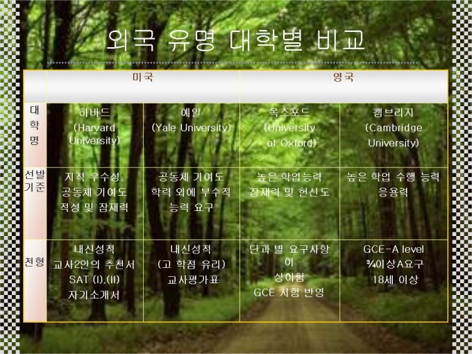 외국 유명 대학별 비교 외국 대학의 시사점 1. 다양한 전형 자료의 활용으로 총체적인 심사과정 확보 2.대학 입시 전담기구의 설치 3.교사에 대한 신뢰를 바탕으로 한 내신평가 반영 4.학력평가 실시의 경우 학생의 선택권 최대 확보 5.대학별 전형 요강제시와 시기간의 충분한 시차 프리젠테이션 자료 (교육_교육사회) 입니다.