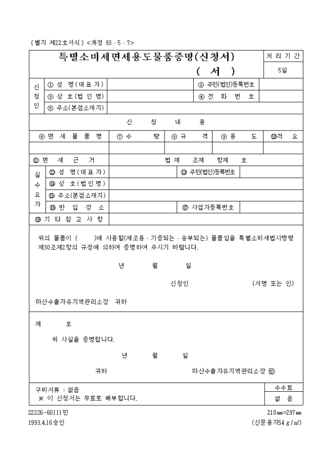 9,000원/월위의 물품이 ( )에 사용할(제조용․기증되는․송부되는) 물품임을 특별소비세법시행령 제30조제2항의 규정에 의하여 증명하고자 할 때 사용하는 "특별소비세 면세용도 물품증명(신청서,서)" 양식입니다.