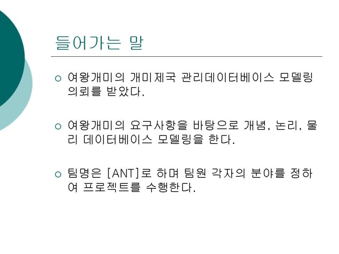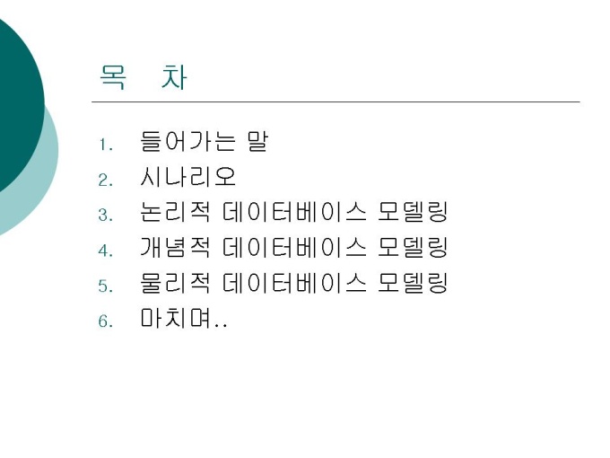 들어가는 말 시나리오 논리적 데이터베이스 모델링 개념적 데이터베이스 모델링 물리적 데이터베이스 모델링 마치며.. 프리젠테이션 자료 (데이터베이스) 입니다.