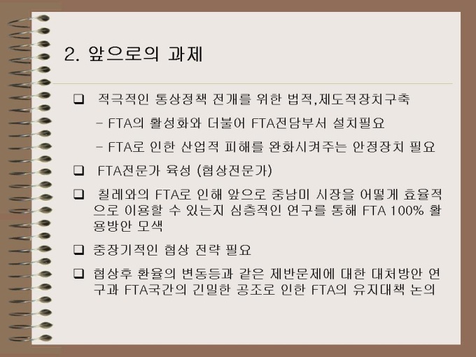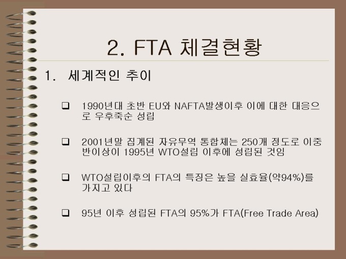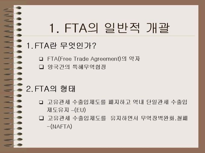 프리젠테이션 자료 (무역) 1. FTA의 일반적 개괄 2. FTA 체결현황 3. FTA의 필요성 4. 한-칠레 FTA 전반 5. 문제점과 대처방안