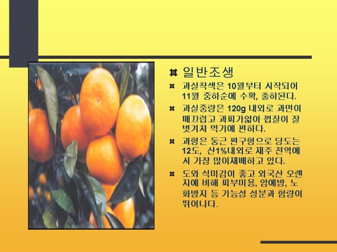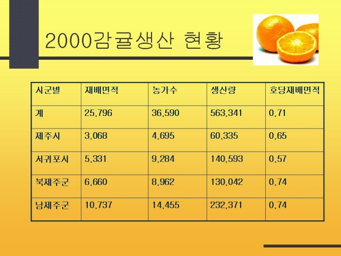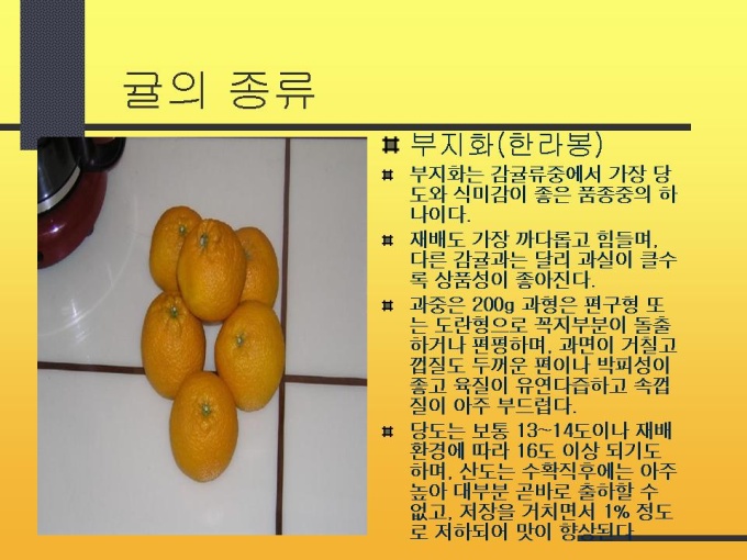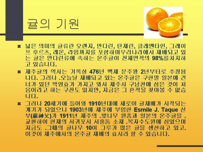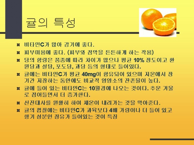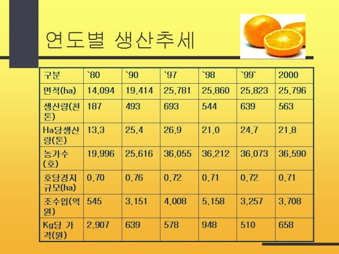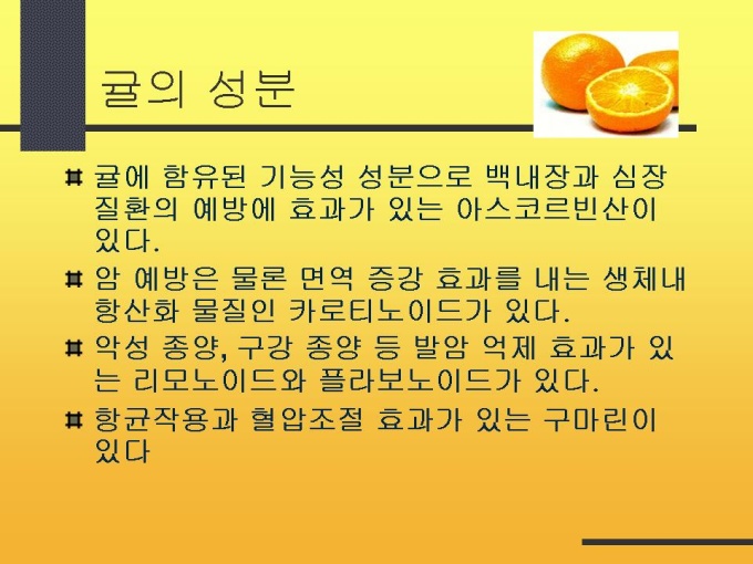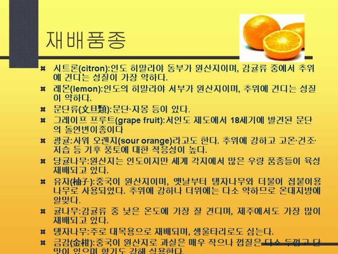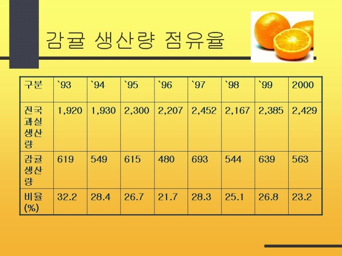 프리젠테이션 자료 (식품영양_귤) 1.귤의 특성 2.감귤류의 원생지 3.귤의 기원 4.귤의 종류 5.2000감귤생산 현황 6.연도별 생산추세 7.감귤 생산량 점유율 8.재배품종 9.귤의 성분 10.귤의 효능 11.귤의 영양성분 12.민간요법 13.좋은 귤 고르는 방법 14.귤을 장기간 보관하는 방법 15.귤의 가공법 16.참고문헌