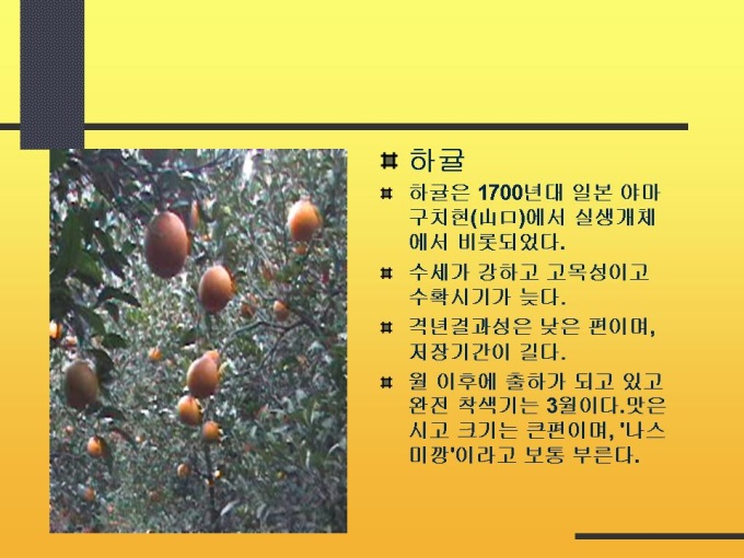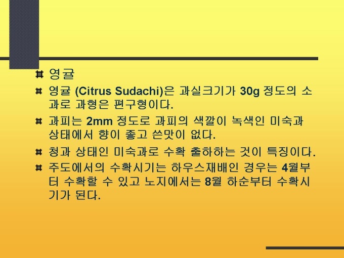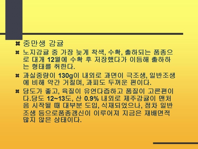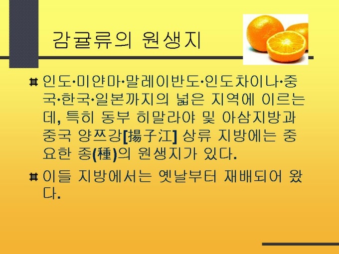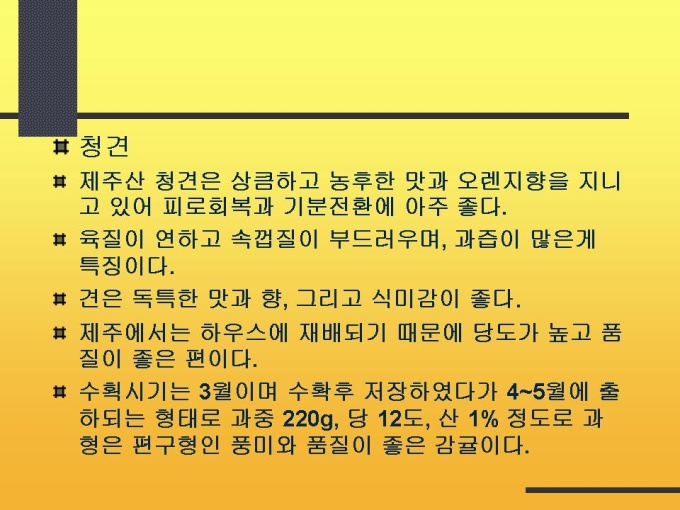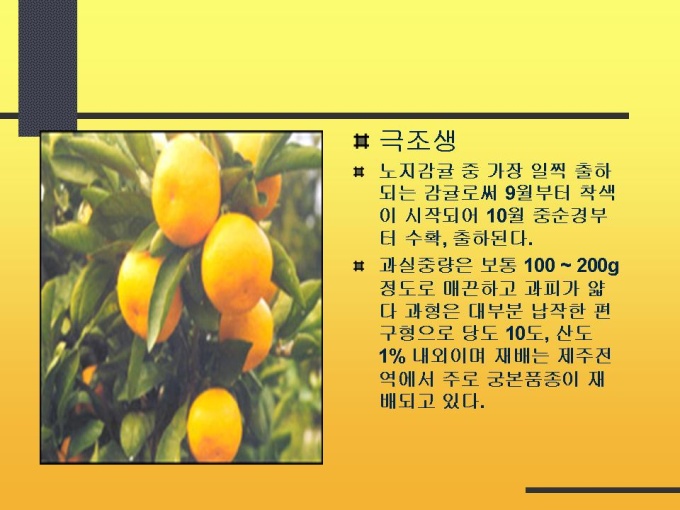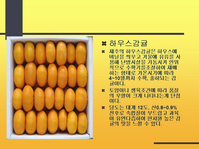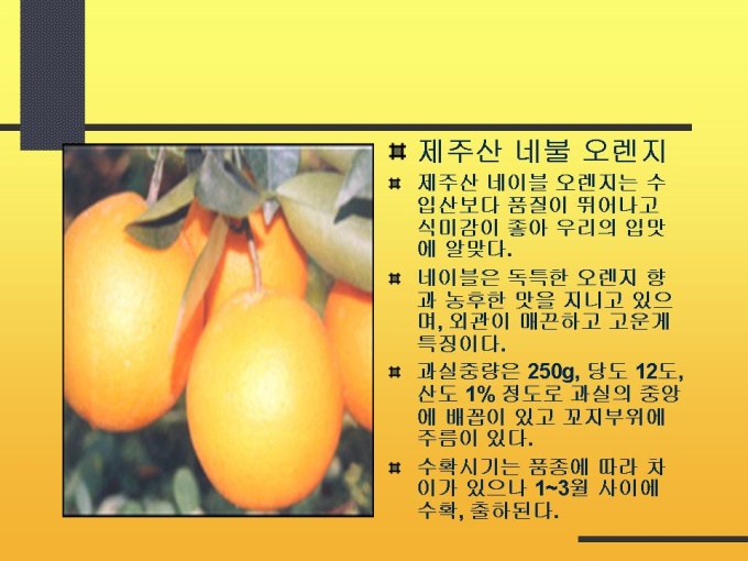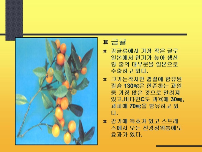 프리젠테이션 자료 (식품영양_귤) 1.귤의 특성 2.감귤류의 원생지 3.귤의 기원 4.귤의 종류 5.2000감귤생산 현황 6.연도별 생산추세 7.감귤 생산량 점유율 8.재배품종 9.귤의 성분 10.귤의 효능 11.귤의 영양성분 12.민간요법 13.좋은 귤 고르는 방법 14.귤을 장기간 보관하는 방법 15.귤의 가공법 16.참고문헌