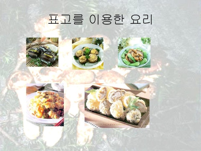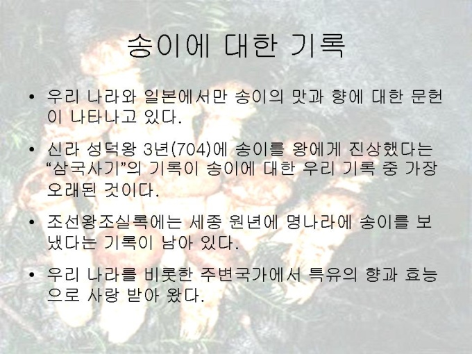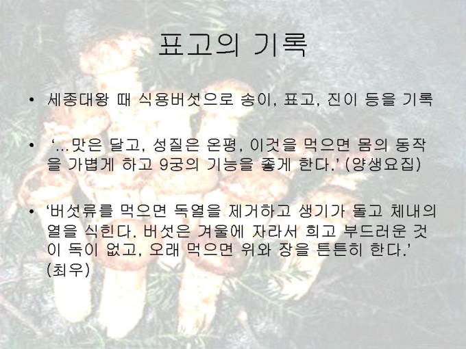 프리젠테이션 자료 (식품영양_버섯) 1.개괄 2.버섯류 성분의 일반적 특징 3.송이버섯과 표고버섯 4.송이에 대한 기록 5.송이의 채취법 6.송이의 보관법 7.송이의 등급 8.송이의 특수 성분 9.송이를 이용한 요리 10.송이의 인공재배 11.표고의 기록 12.표고의 특징 13.표고의 수확기와 보관법 14.표고의 종류 15.표고의 주산지와 분포 16.표고의 특수 성분 17.표고를 이용한 요리 18.표고 그림 19.버섯의 성분비교표 20.참고문헌