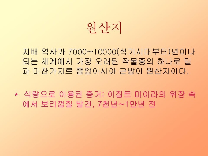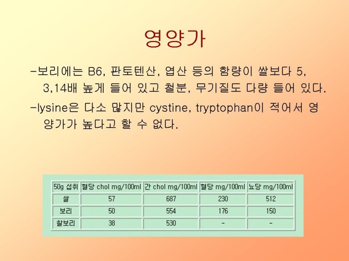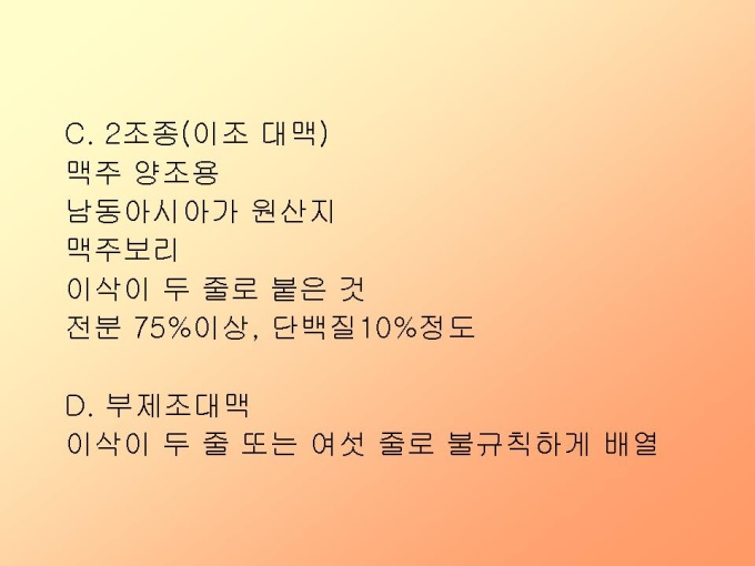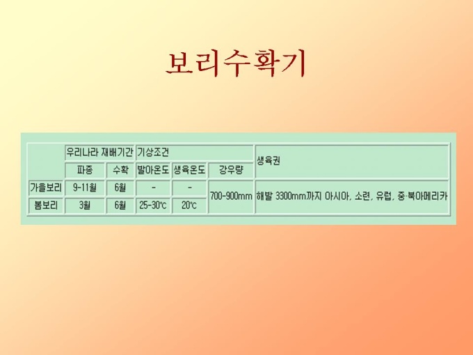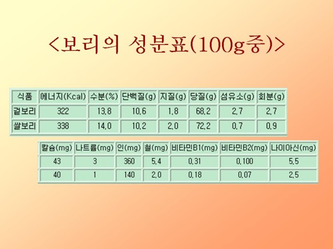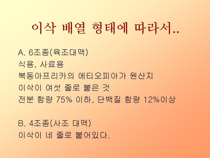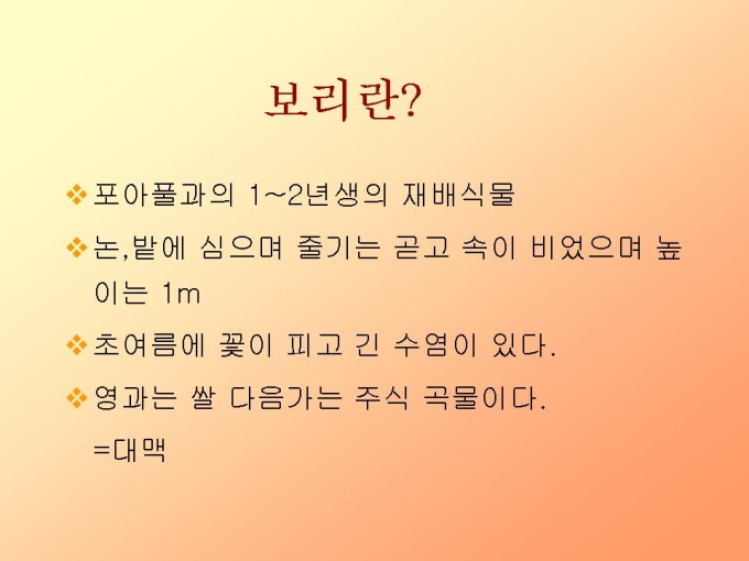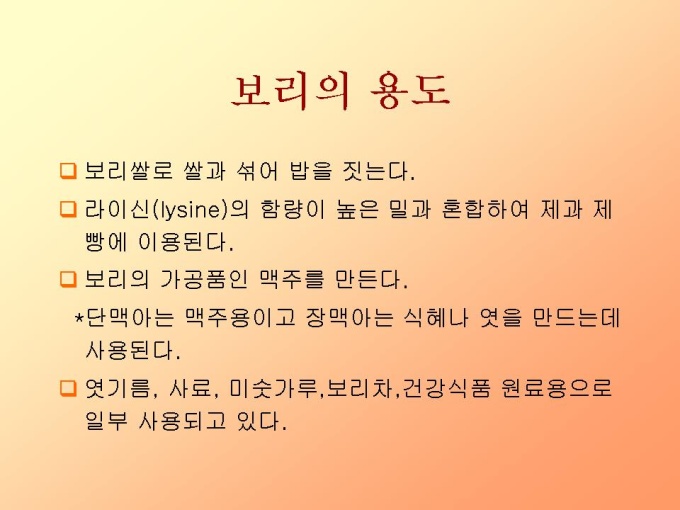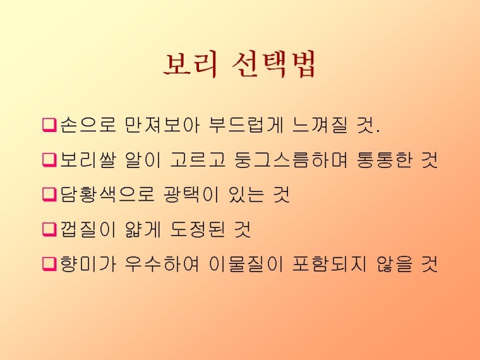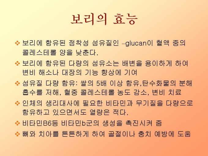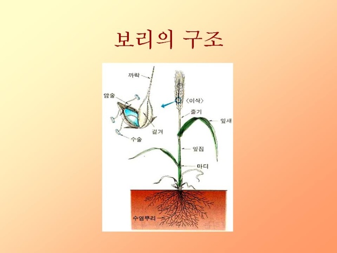 프리젠테이션 자료 (식품영양_보리) 1.보리란? 2.보리의 구조 3.원산지 4.생산지 5.유래 6.보리껍질의 분리 정도에 따라 7.이삭 배열 형태에 따라서 8.보리수확기 9.파종시기와 저장성 10.저장성 11.영양가 12.보리의 효능 13.소화 흡수율 14.보리의 용도 15.보리 선택법