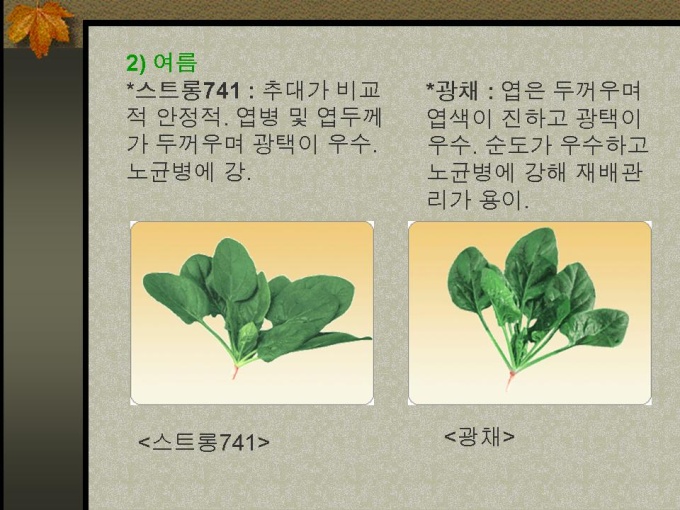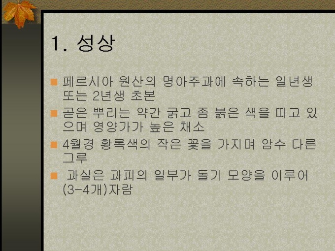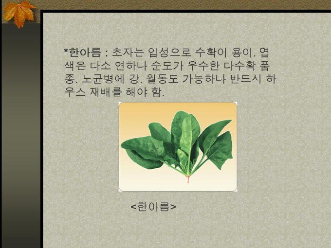 프리젠테이션 자료 (식품영양_시금치) 1.성상 2.재배 3.성분 4.재배방법에 따른 성분차이 5.시금치 재배 6.작형별 시금치 품종과 각 특성 7.먹는 방법과 효능 8.약으로서의 효능 9.보존 10.참고