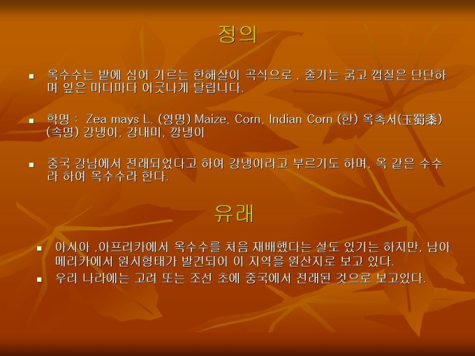 프리젠테이션 자료 (식품영양_옥수수) 1.정의 2.유래 3.재배조건 및 재배분포 4.자라는 과정 5.종류 6.옥수수의 성분 7.생산·소비·수출입동향 8.옥수수의 효능 9.옥수수 요리 10.참고