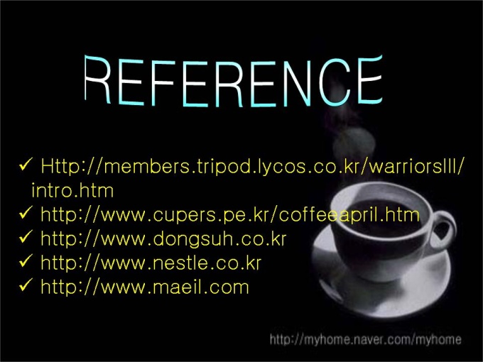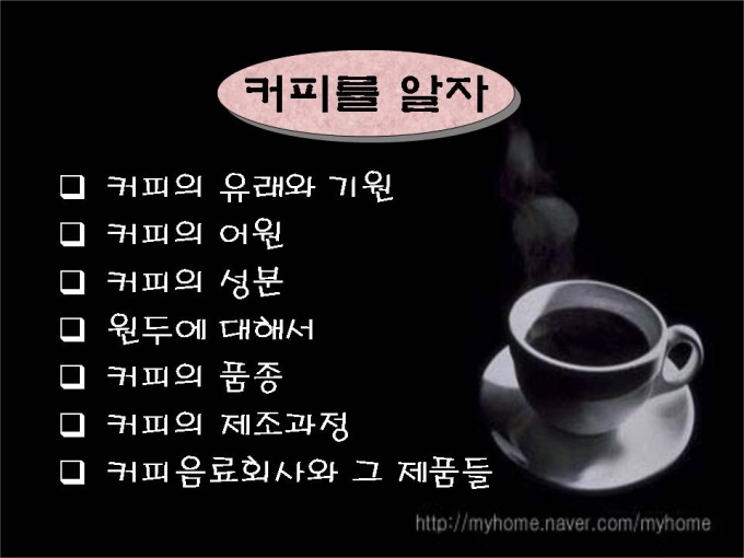 프리젠테이션 자료 (식품영양_커피) 1.커피를 알자 2.커피의 유래와 기원 3.커피의 어원 4.커피의 성분 5.원두에 대해서 6.커피의 품종 7.커피의 제조과정 8.커피 음료회사와 그 제품들