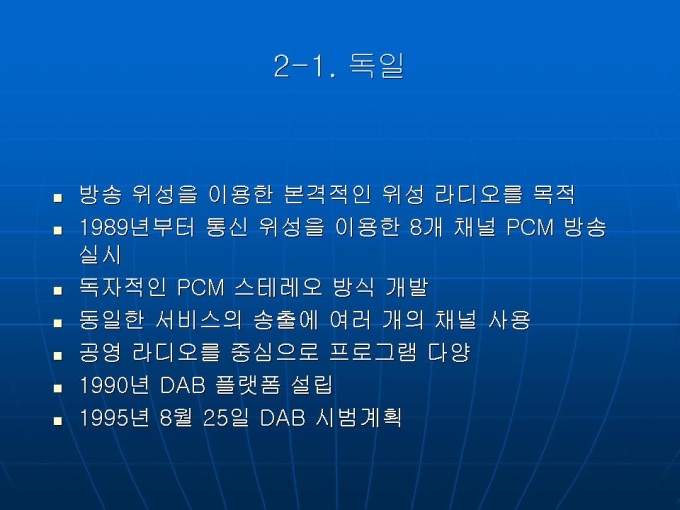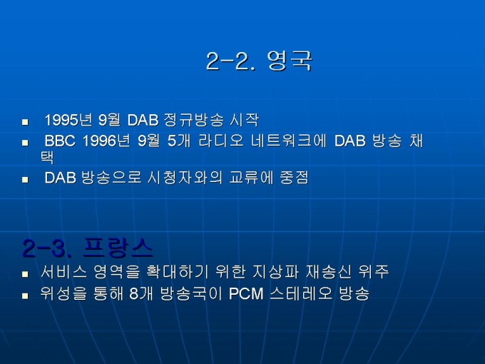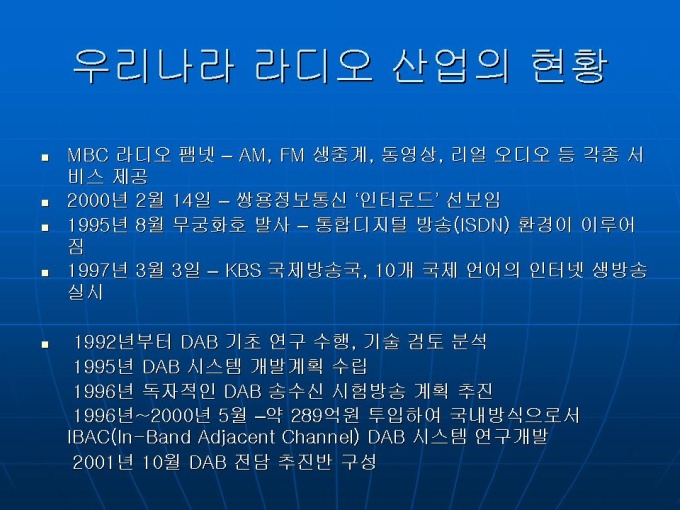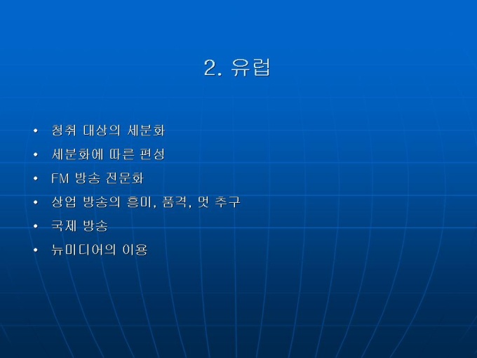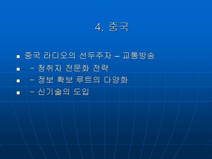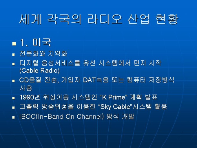 프리젠테이션 자료 (언론영상학_라디오) 세계 각국의 라디오 산업 현황입니다. 1. 미국 2. 유럽 3. 일본 4. 중국 5.한국 라디오 방송의 문제점과 생존전략