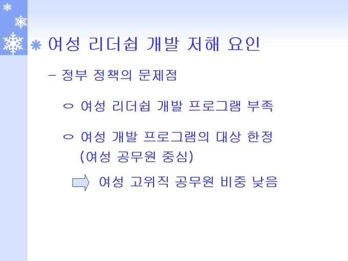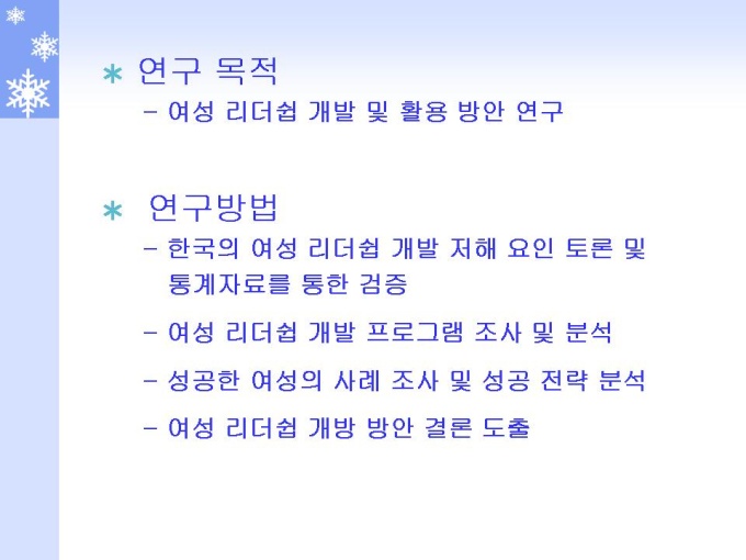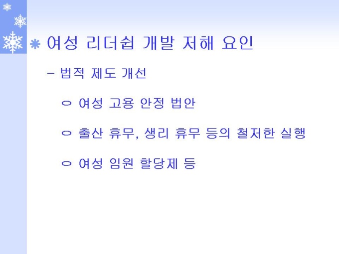 프리젠테이션 자료 (여성심리학_리더쉽) 여성 리더쉽 개발 및 활용 방안에 관한 연구입니다. 한국의 여성 리더쉽 개발 저해 요인 토론 및 통계자료를 통한 검증, 여성 리더쉽 개발 프로그램 조사 및 분석, 성공한 여성의 사례 조사 및 성공 전략 분석, 여성 리더쉽 개방 방안 결론을 도출하였습니다.