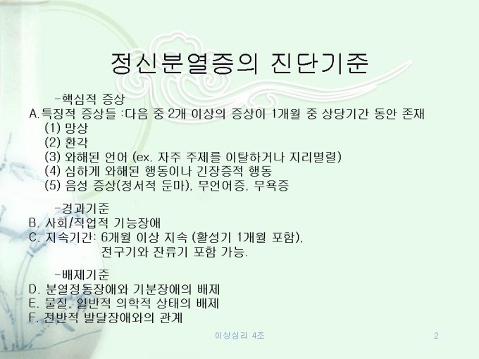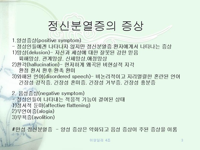 프리젠테이션 자료 (심리학_이상심리) 1.정신분열증의 진단기준 2.정신분열증의 증상 3.정신분열증의 원인 4.정신분열증과 유사한 정신증적 장애 5.정신분열증의 치료