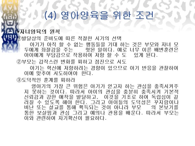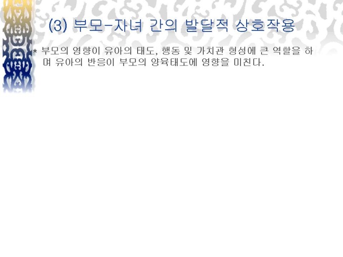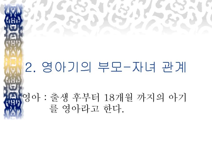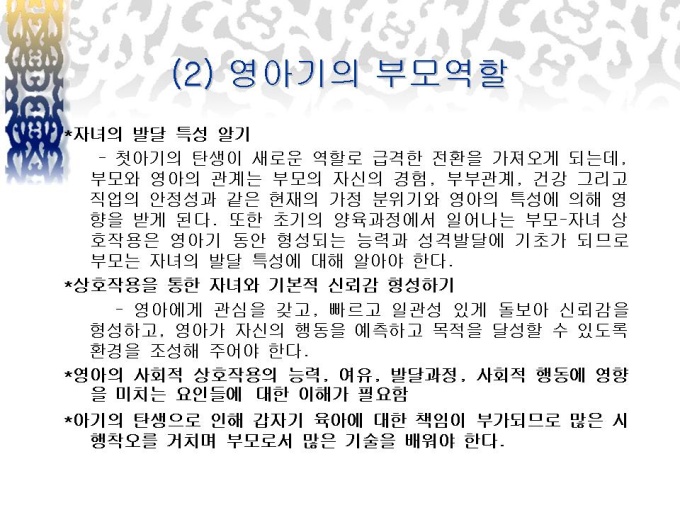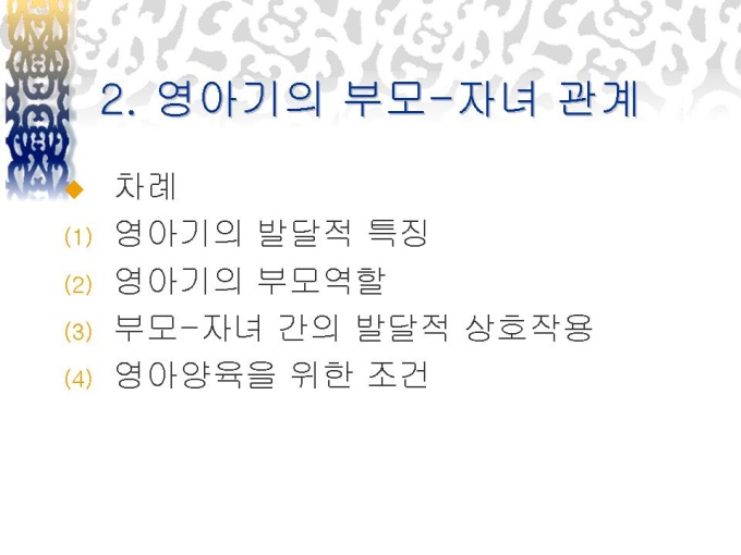 프리젠테이션 자료 (유아교육_영아기) 발달 단계에 따른 부모-자녀 관계(영아기, 유아기)에 대한 내용입니다.