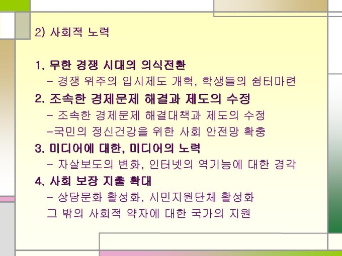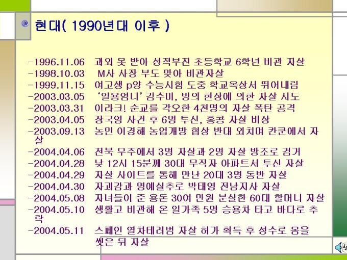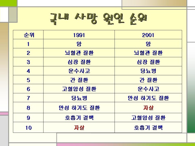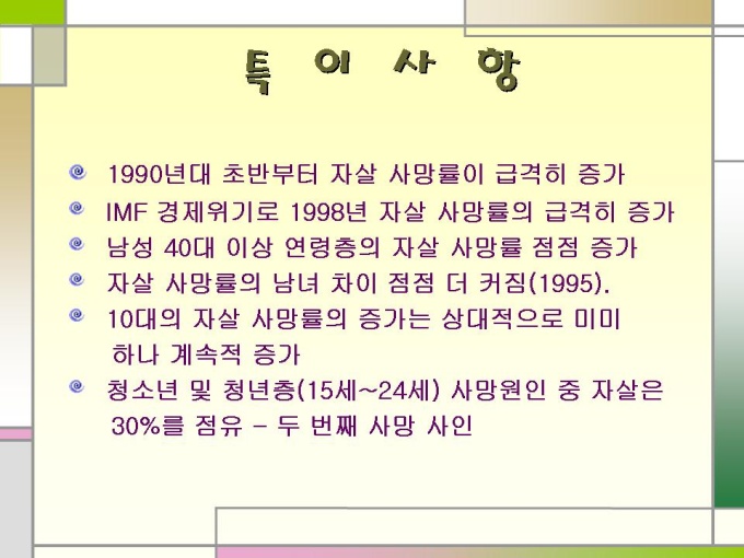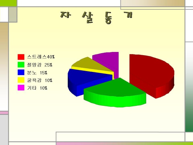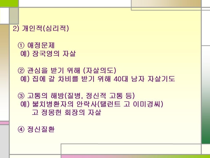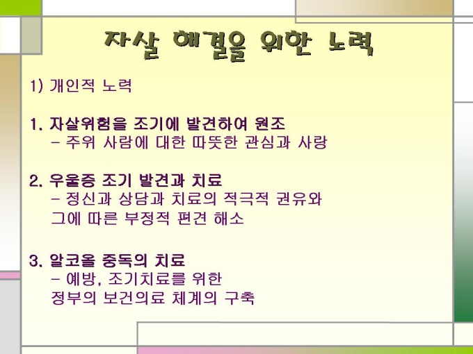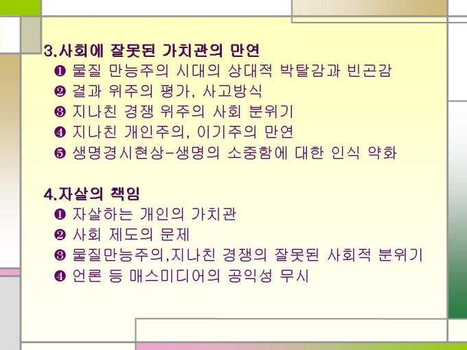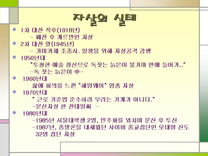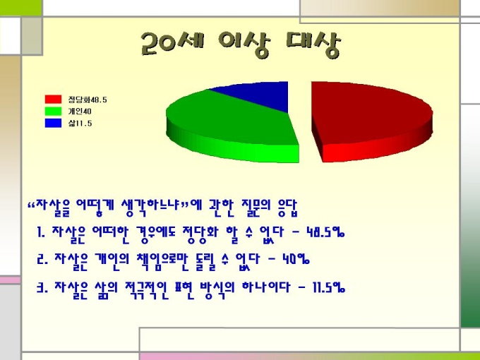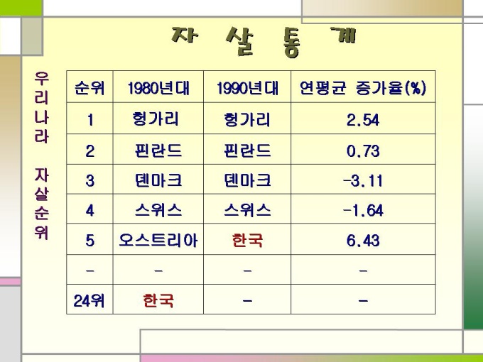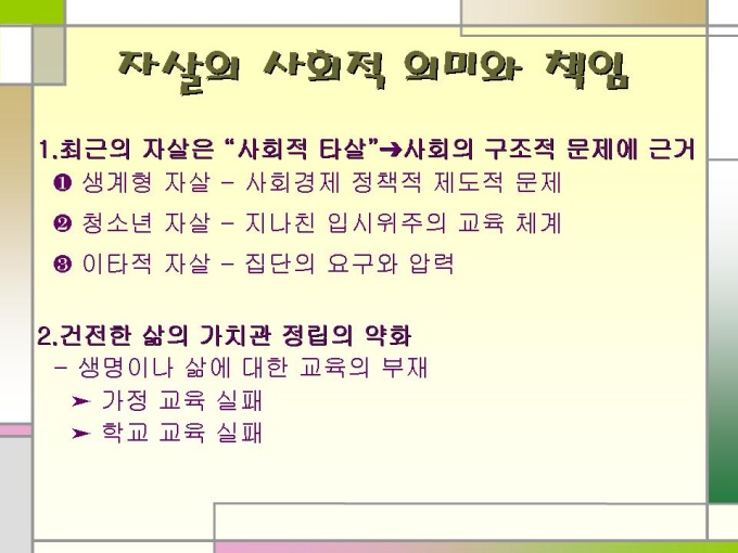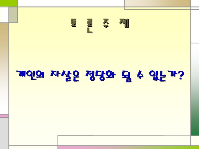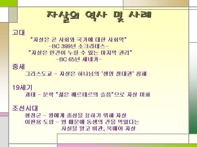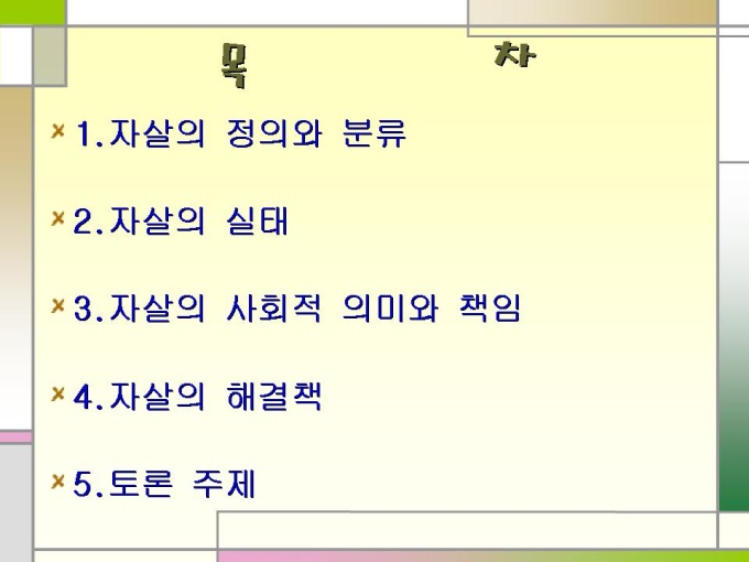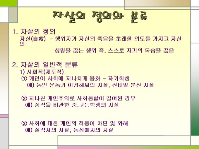 프리젠테이션 자료 (자살) 1.자살의 정의와 분류 2.자살의 실태 3.자살의 사회적 의미와 책임 4.자살의 해결책 5.토론 주제