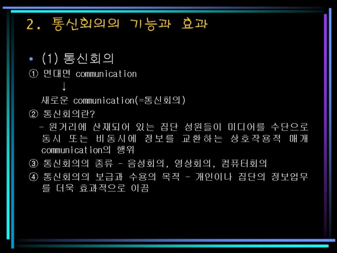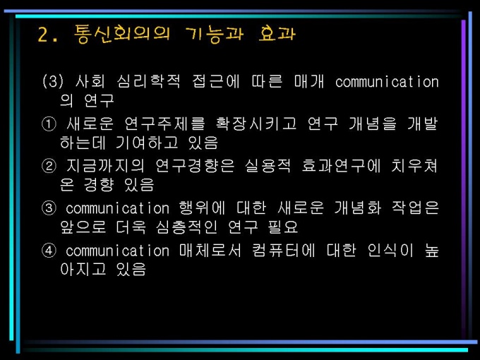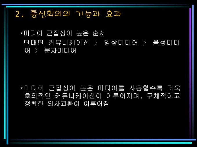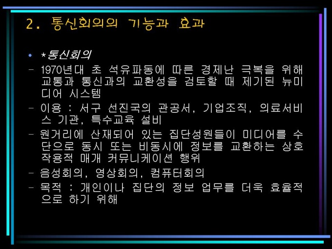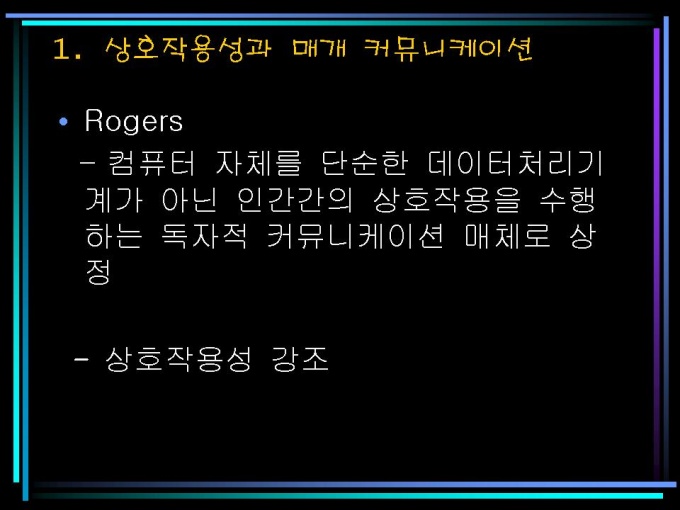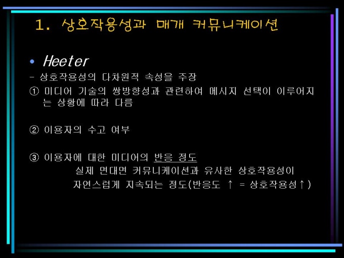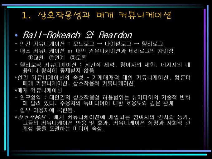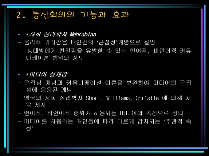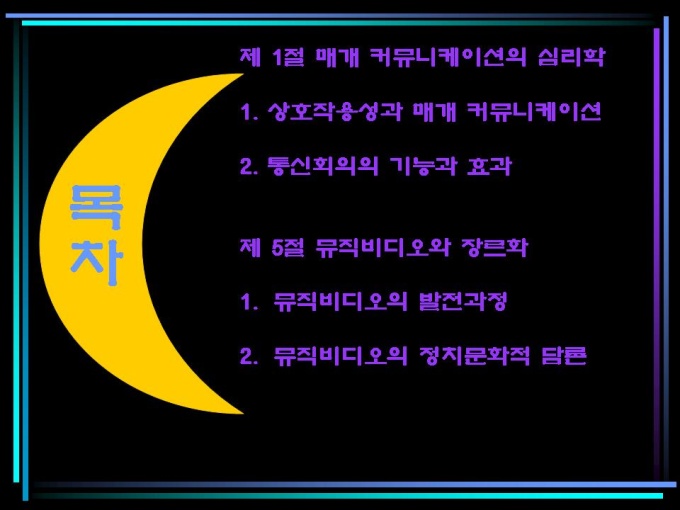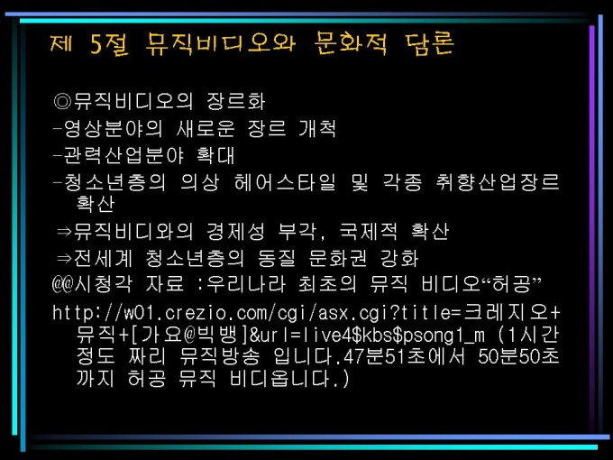 프리젠테이션 자료 (정보사회와 멀티미디어) 제 1절 매개 커뮤니케이션의 심리학 1. 상호작용성과 매개 커뮤니케이션 2. 통신회의의 기능과 효과 제 5절 뮤직비디오와 장르화 1. 뮤직비디오의 발전과정 2. 뮤직비디오의 정치문화적 담론