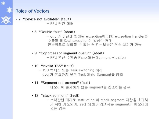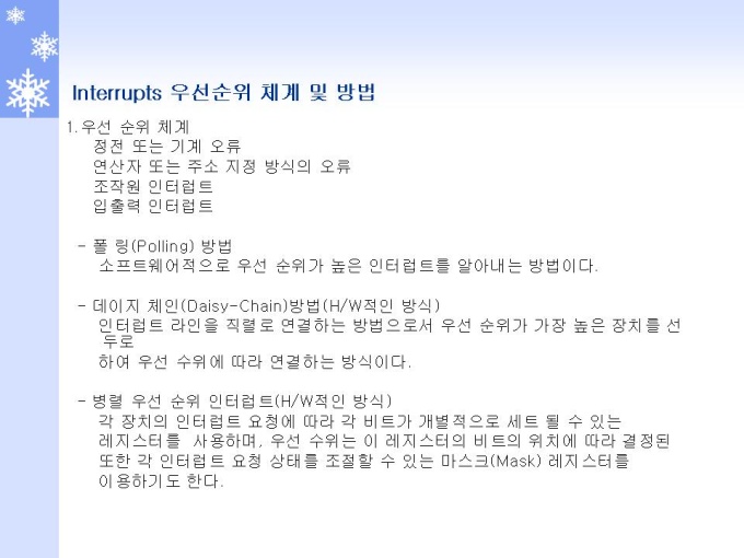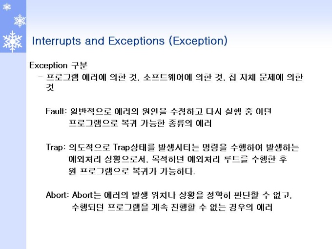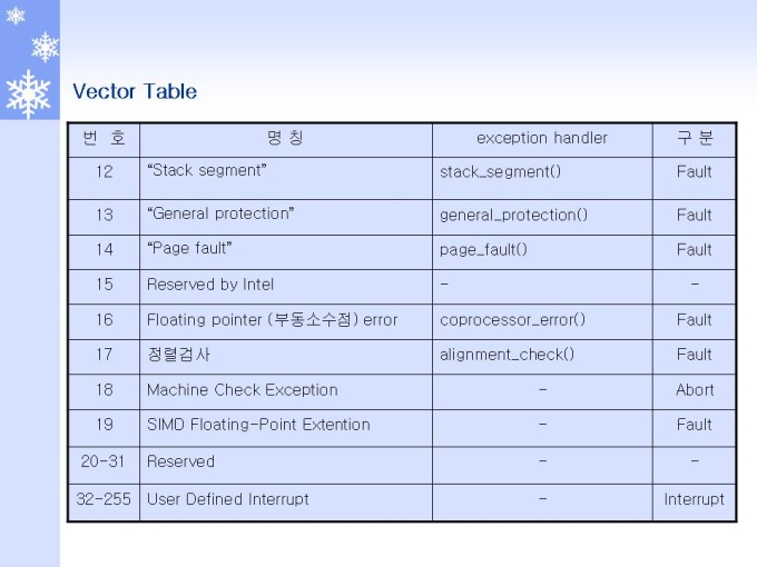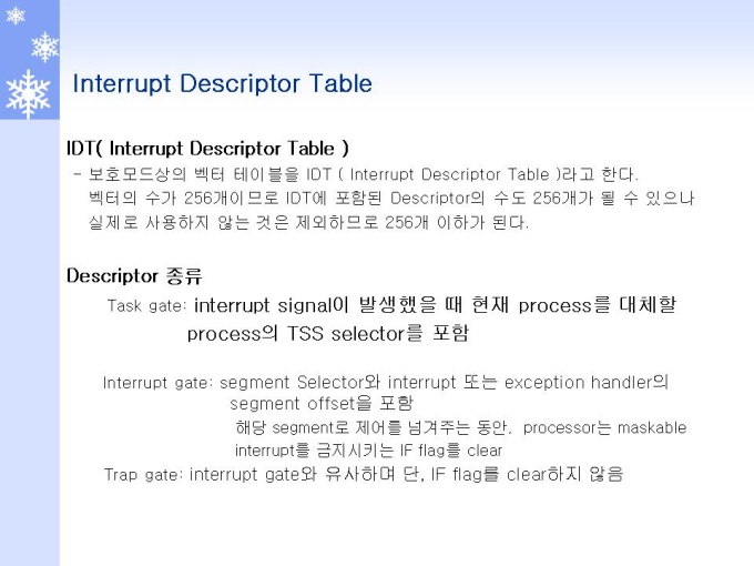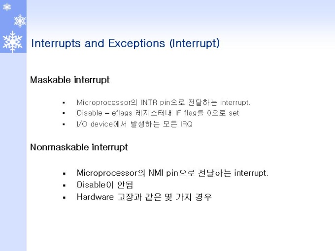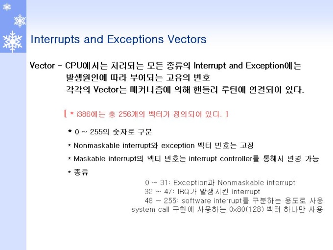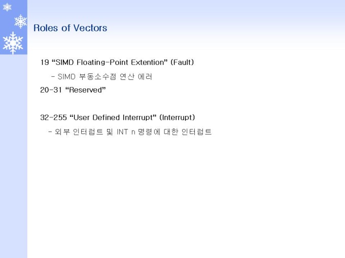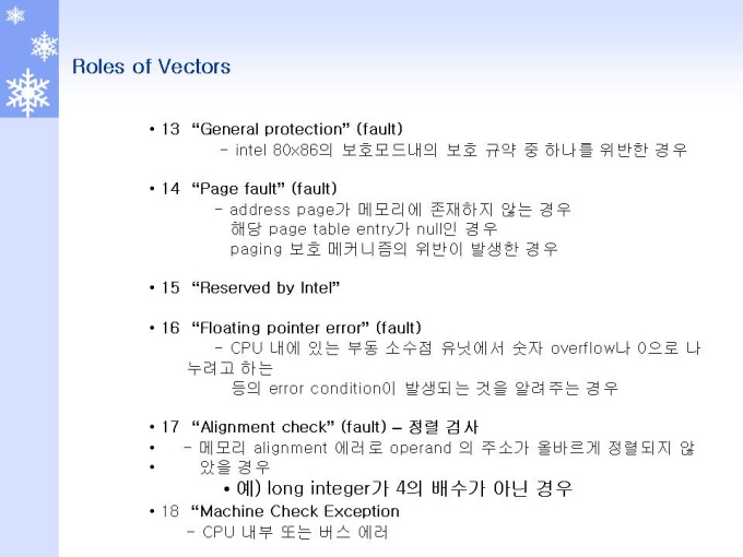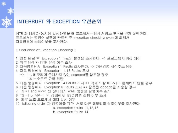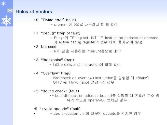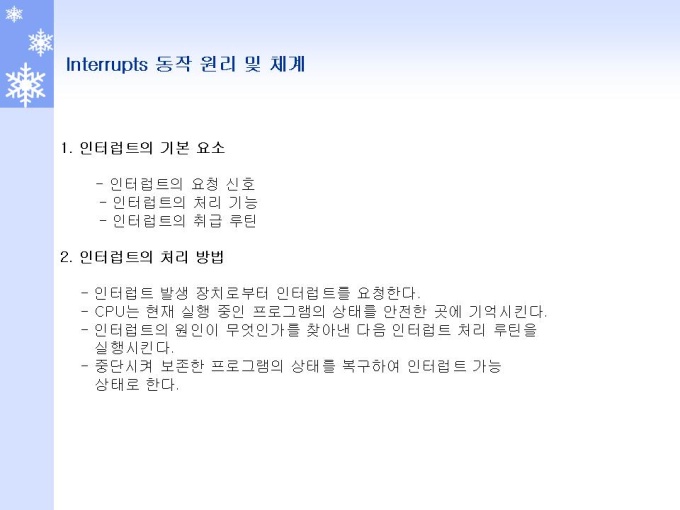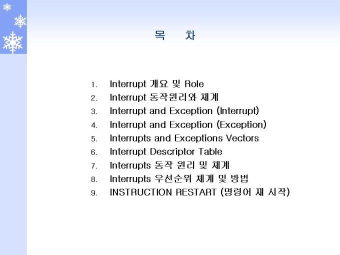 프리젠테이션 자료 (정보통신_인텔) 1.Interrupt 개요 및 Role 2.Interrupt 동작원리와 체계 3.Interrupt and Exception (Interrupt) 4.Interrupt and Exception (Exception) 5.Interrupts and Exceptions Vectors 6.Interrupt Descriptor Table 7.Interrupts 동작 원리 및 체계 8.Interrupts 우선순위 체계 및 방법 9.INSTRUCTION RESTART (명령어 재 시작)