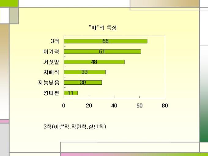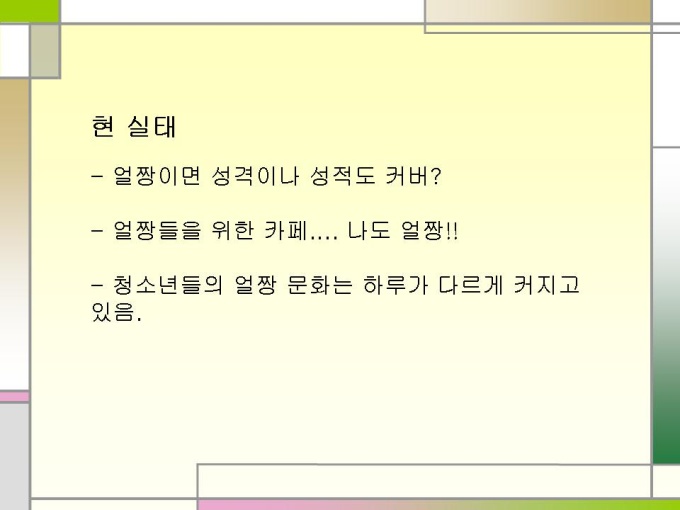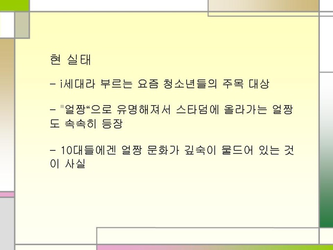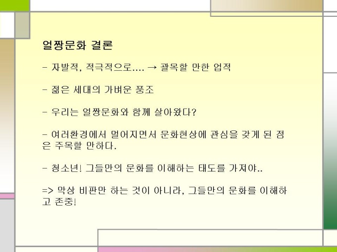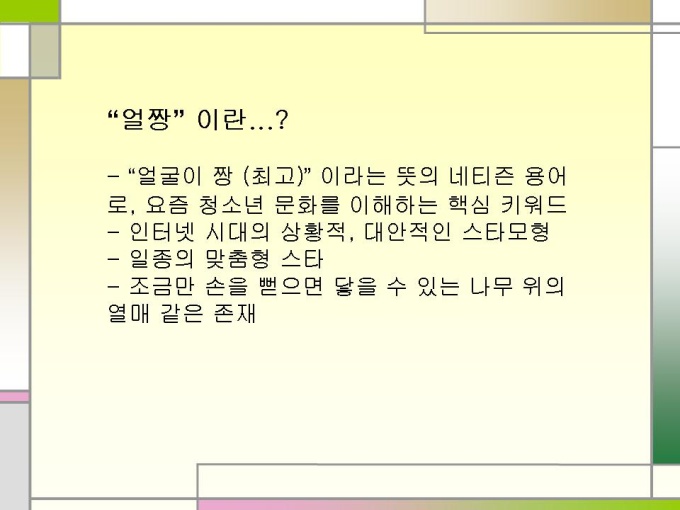 프리젠테이션 자료 (청소년문화) 신세대 청소년 문화. 1.얼짱이란...? 2.얼짱의 배경 3.얼짱 신드롬의 영향 4.현 실태 5.얼짱문화 결론 6.청소년 문화의 특성 7.왕따 경험 통계 8.왕따의 영향 9.왕따의 원인 10.해외 집단 따돌림의 해결방안 11.집단 따돌림의 대책 12.교사의 관심이 중요
