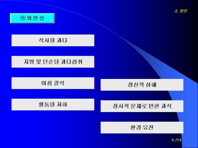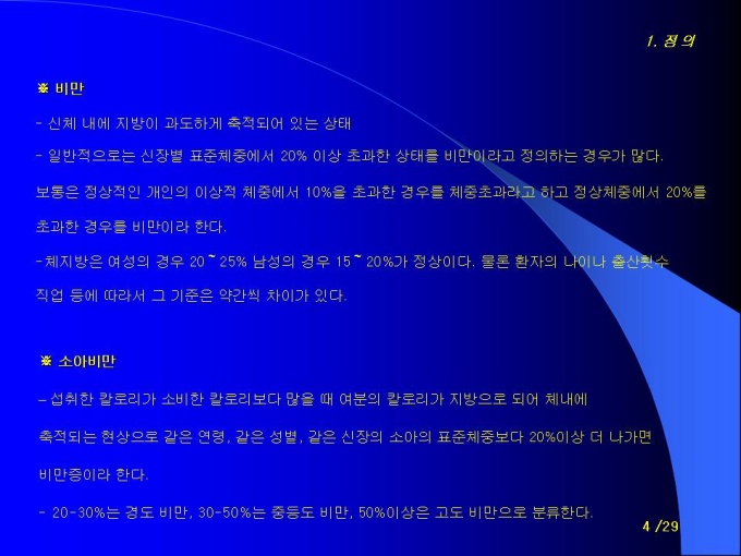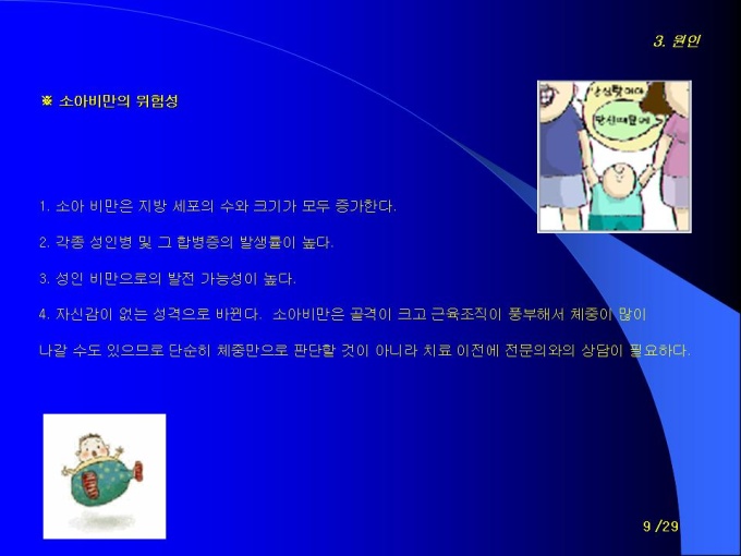 프리젠테이션 자료 (청소년학과_비만) 1.도입 2.정의 3.비만의 종류 4.원인 5.진단기준 6.비만의 위험성 7.증상 8.치료 및 예방법 9.비만아동 행동수정을 통한 치료기법 10.사례