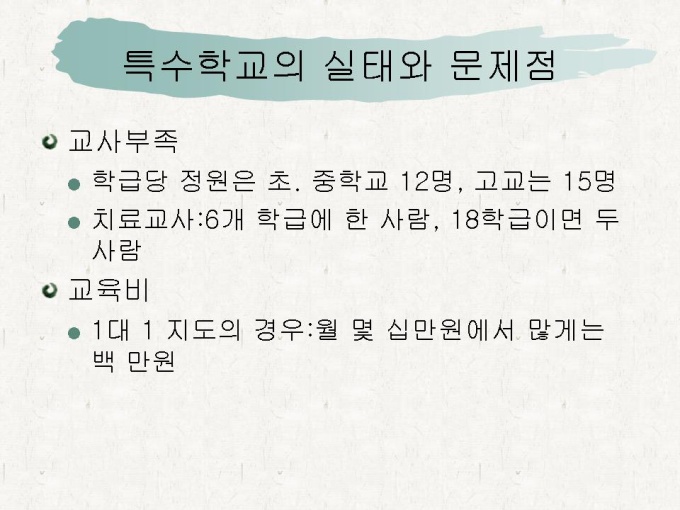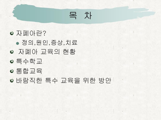 프리젠테이션 자료 (특수교육_자폐아1) 1.자폐아란? -정의,원인,증상,치료 2.자폐아 교육의 현황 3.특수학교 4.통합교육 5.바람직한 특수 교육을 위한 방안