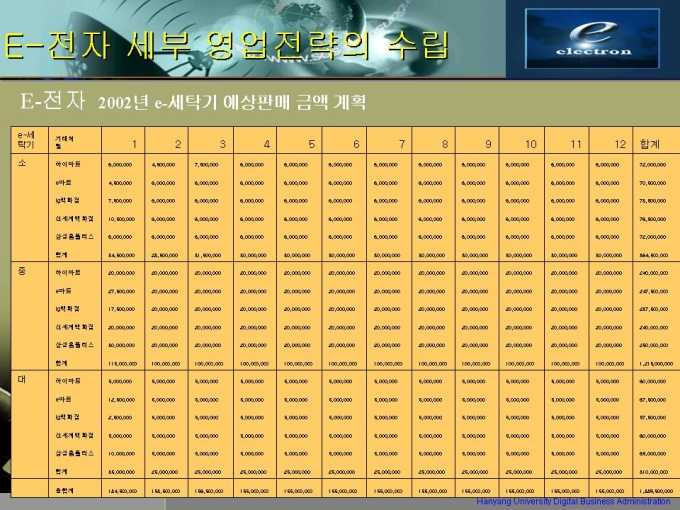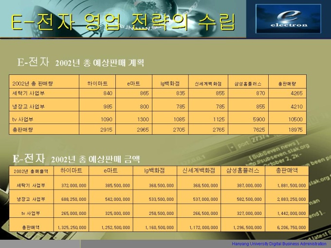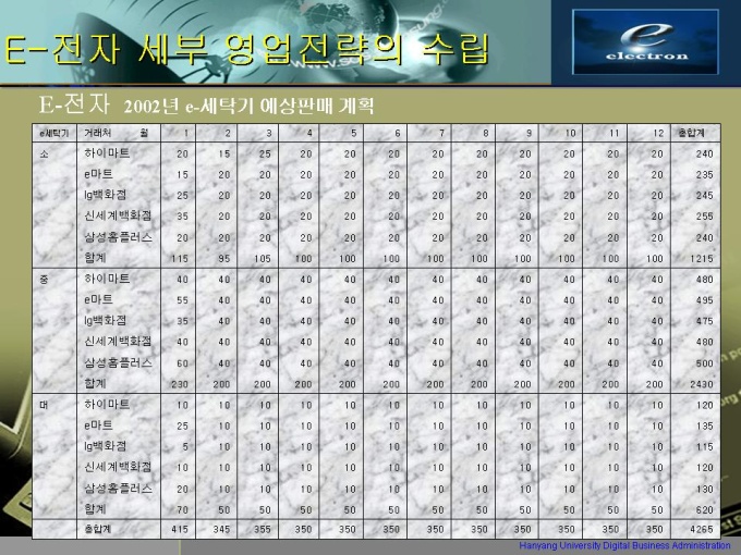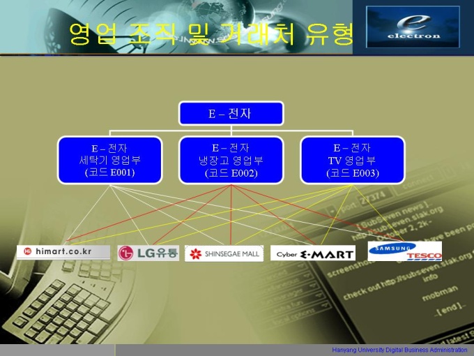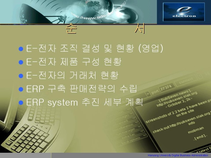 프리젠테이션 자료 (ERP) 1.E-전자 조직 결성 및 현황 (영업) 2.E-전자 제품 구성 현황 3.E-전자의 거래처 현황 4.ERP 구축 판매전략의 수립 5.ERP system 추진 세부 계획