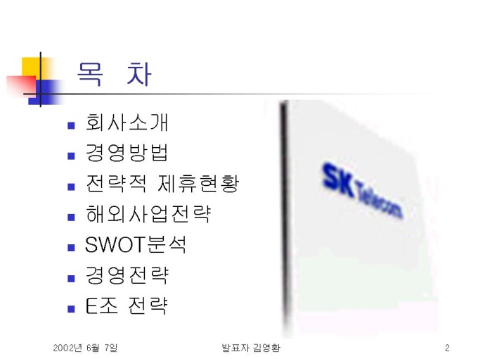 회사소개 경영방법 전략적 제휴현황 해외사업전략 SWOT분석 경영전략 E조 전략 프리젠테이션 자료 (경영_경영전략) 입니다.