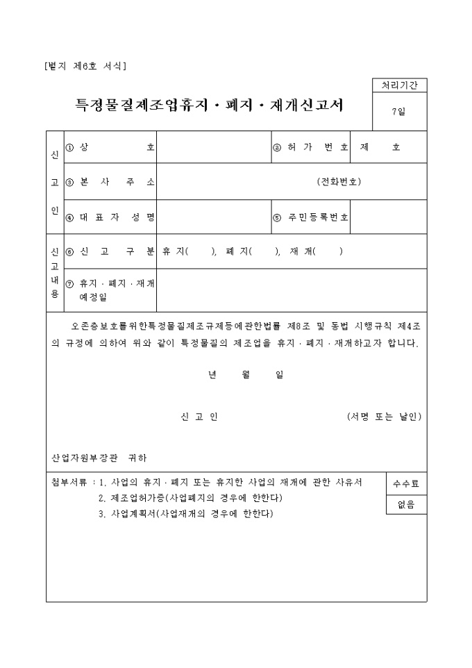9,000원/월오존층보호를위한특정물질제조규제등에관한법률 제8조 및 동법 시행규칙 제4조의 규정에 의하여 위와 같이 특정물질의 제조업을 휴지, 폐지, 재개하고자 할 경우 사용하는 "특정 물질 제조업휴지, 폐지, 재개신고서" 양식입니다.