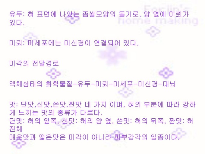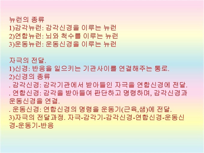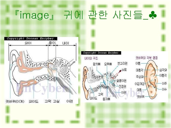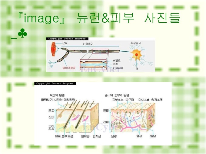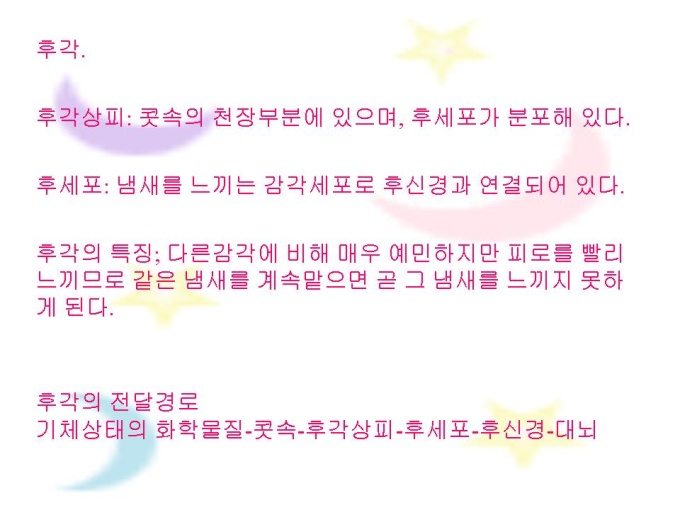 모양체: 수정체의 두께를 조절하여 원근을 조절. 홍채: 동공의 크기를 변화시켜 눈으로 들어오는 빛의 양을 조절. 망막: 물체의 상이 맺히는 곳으로 시세포가 있음. (카메라의 필름) 맥락막: 검은색 멜라닌색소를 포함해서 눈의 내부를 어둡게 하여 상이 맺힘.(카메라의 어둠상자) 각막: 눈의 가장앞쪽의 투명한 막. 공막의 일부가 변형되어 된 것. 수정체: 볼록렌즈모양이며, 빛을 굴절시켜 망막에 상이 맺히게 함.(카메라의 렌즈) 맹점: 시신경이 모여 뇌로 가는 곳 으로, 시세포가 없어 상이 맺혀도 보이지 않음. 시각의 전달경로 : 빛-각막-수정체-유리체-망막(시세포)-시신경-대뇌 프리젠테이션 자료 (생물_감각) 입니다.
