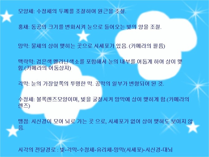 수정체: 볼록렌즈모양이며, 빛을 굴절시켜 망막에 상이 맺히게 함.(카메라의 렌즈)