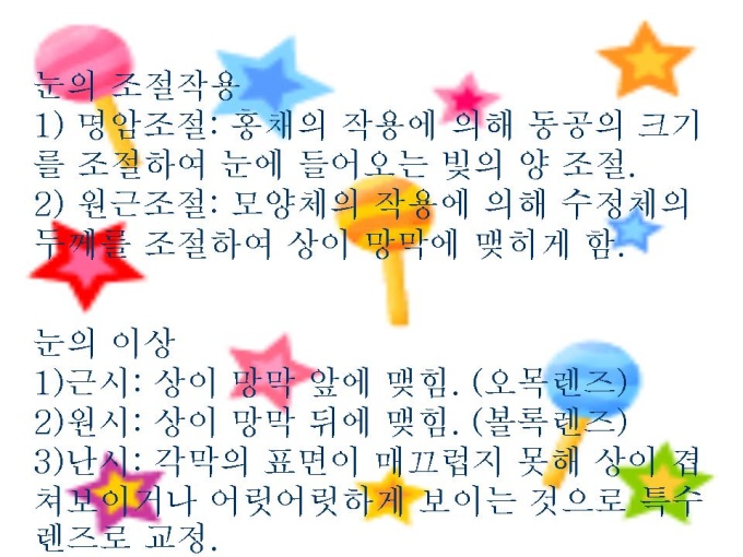 모양체: 수정체의 두께를 조절하여 원근을 조절.