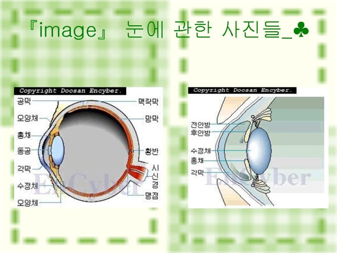 홍채: 동공의 크기를 변화시켜 눈으로 들어오는 빛의 양을 조절.