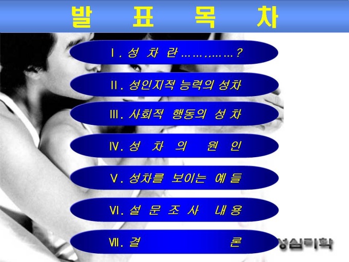 Ⅰ. 성차란 ……..……? Ⅱ. 성인지적 능력의 성차 Ⅲ. 사회적 행동의 성 차 Ⅳ. 성차의 원인 Ⅴ. 성차를 보이는 예들 Ⅵ. 설문조사 내용 Ⅶ. 결론 프리젠테이션 자료 (성심리학_성차별) 입니다.