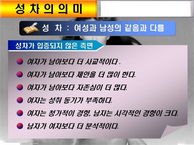 프리젠테이션 자료 (성심리학_성차별) 입니다.