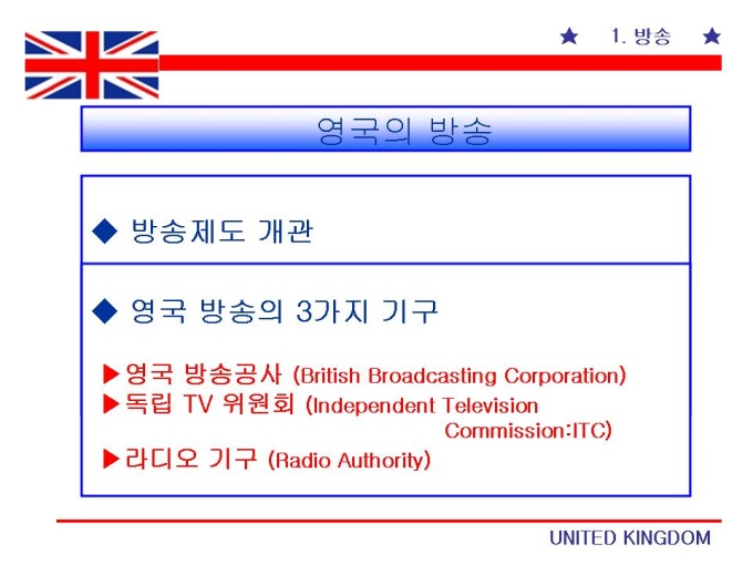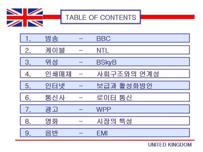 1.방송 - BBC 2.케이블 - NTL 3.위성 - BSkyB 4.인쇄매체 - 사회구조와의 연계성 5.인터넷 - 보급과 활성화방안 6.통신사 - 로이터 통신 7.광고 - WPP 8.영화 - 시장의 특성 9.음반 - EMI 프리젠테이션 자료 (언론영상학_영국매체) 입니다.