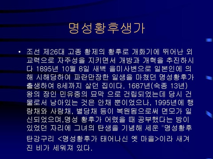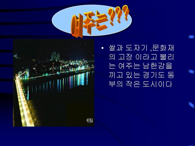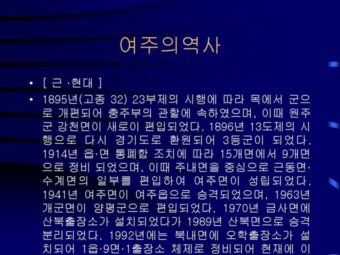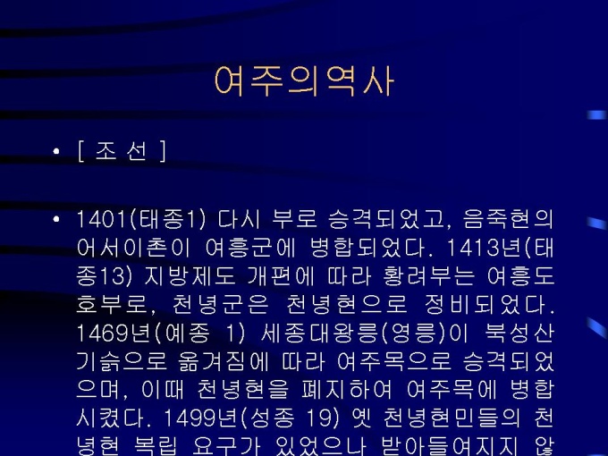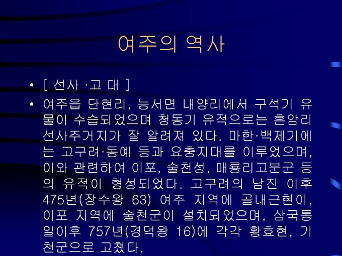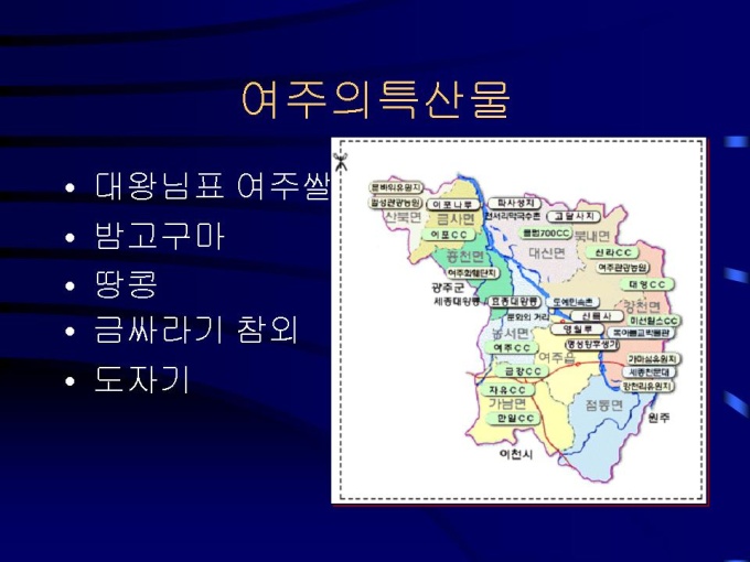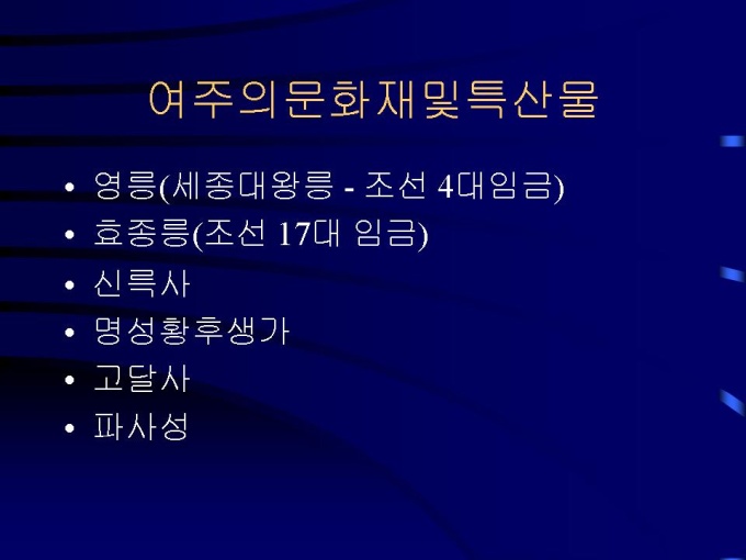 여주의 역사 여주의문화재및특산물 영릉 효종릉 신륵사 명성황후생가 고달사 파사성 여주의특산물 대왕님표여주쌀 밤고구마 땅콩 금싸라기 참외 도자기 프리젠테이션 자료 (지역소개) 입니다.