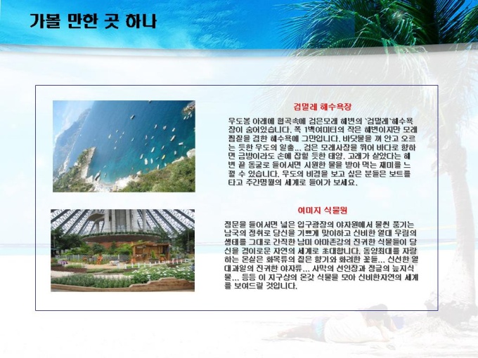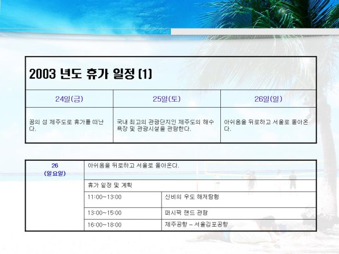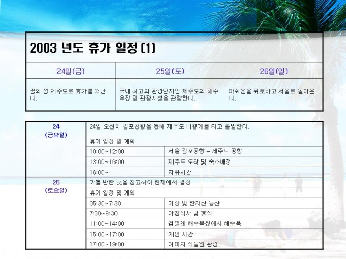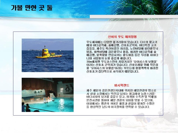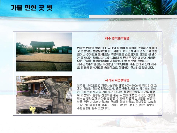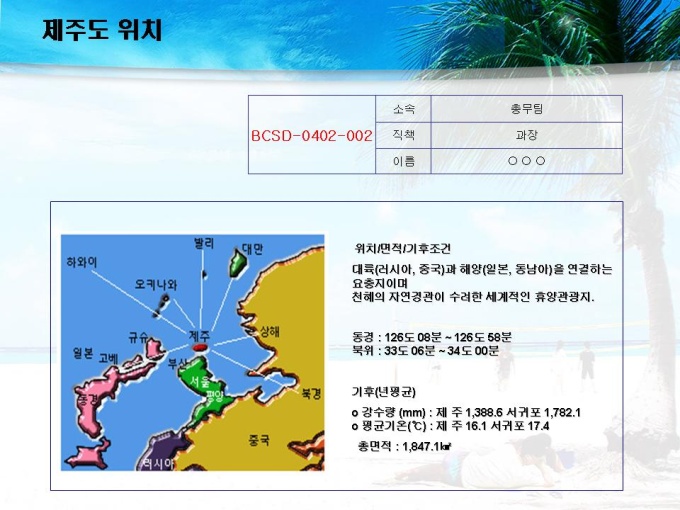 기획서 (여름 휴가계획) 제주도 위치, 숙소, 휴가일정 (2박3일), 가볼만한 곳이 소개되어 있습니다.