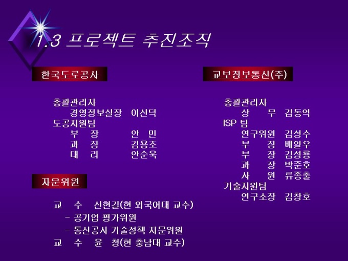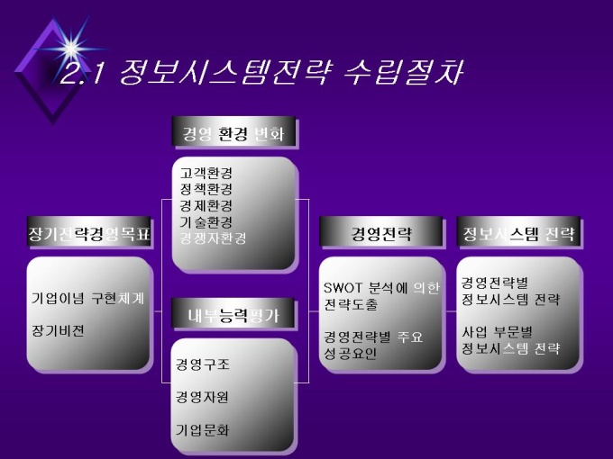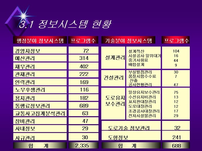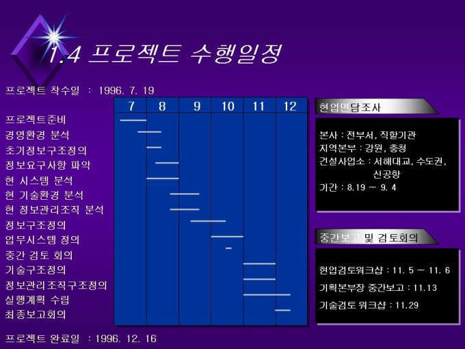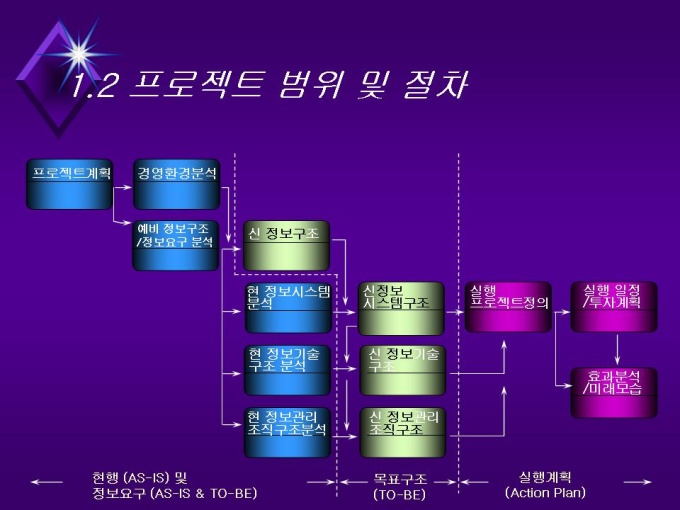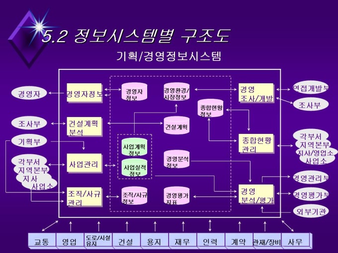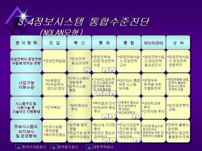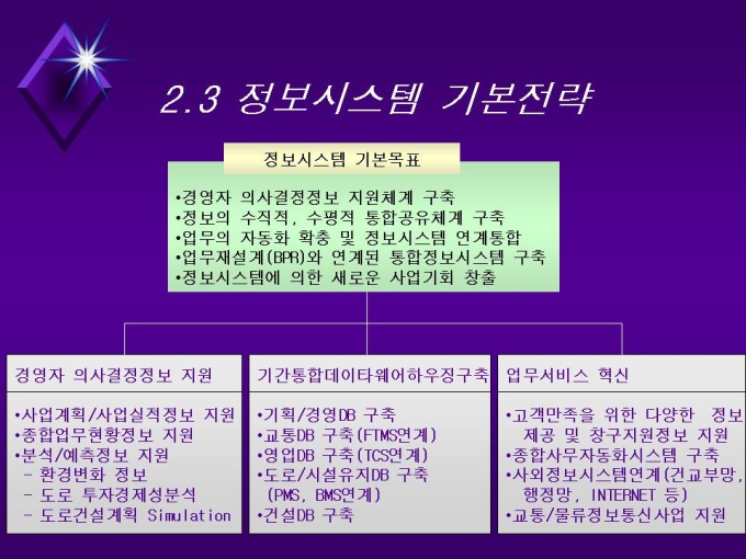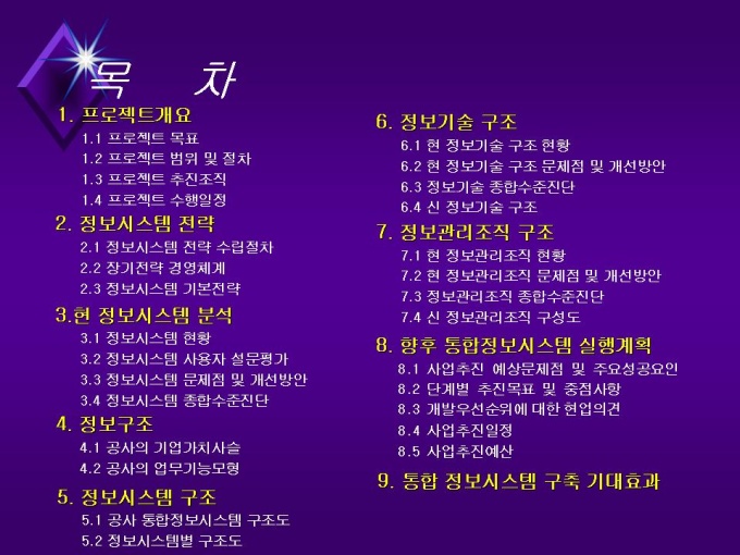 기획서 (정보시스템) 1. 프로젝트개요 1.1 프로젝트 목표 1.2 프로젝트 범위 및 절차 1.3 프로젝트 추진조직 1.4 프로젝트 수행일정 2. 정보시스템 전략 2.1 정보시스템 전략 수립절차 2.2 장기전략 경영체계 2.3 정보시스템 기본전략 3.현 정보시스템 분석 3.1 정보시스템 현황 3.2 정보시스템 사용자 설문평가 3.3 정보시스템 문제점 및 개선방안 3.4 정보시스템 종합수준진단 4. 정보구조 4.1 공사의 기업가치사슬 4.2 공사의 업무기능모형 5. 정보시스템 구조 5.1 공사 통합정보시스템 구조도 5.2 정보시스템별 구조도 6. 정보기술 구조 6.1 현 정보기술 구조 현황 6.2 현 정보기술 구조 문제점 및 개선방안 6.3 정보기술 종합수준진단 6.4 신 정보기술 구조 7. 정보관리조직 구조 7.1 현 정보관리조직 현황 7.2 현 정보관리조직 문제점 및 개선방안 7.3 정보관리조직 종합수준진단 7.4 신 정보관리조직 구성도 8. 향후 통합정보시스템 실행계획 8.1 사업추진 예상문제점 및 주요성공요인 8.2 단계별 추진목표 및 중점사항 8.3 개발우선순위에 대한 현업의견 8.4 사업추진일정 8.5 사업추진예산 9. 통합 정보시스템 구축 기대효과