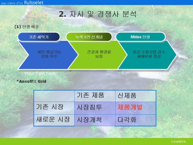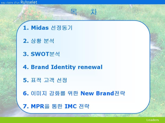 기획서 (제품생산) 1. Midas 선정동기 2. 상황 분석 3. SWOT분석 4. Brand Identity renewal 5. 표적 고객 선정 6. 이미지 강화를 위한 New Brand전략 7. MPR을 통한 IMC 전략
