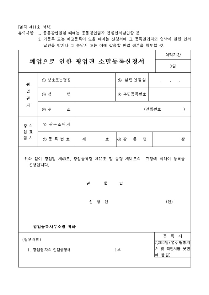 광업법 제43조, 광업등록령 제20조 및 동령 제61조의 규정에 의하여 등록을 신청하고자 할 때 사용하는 "폐업으로 인한 광업권 소멸 등록신청서" 양식입니다.