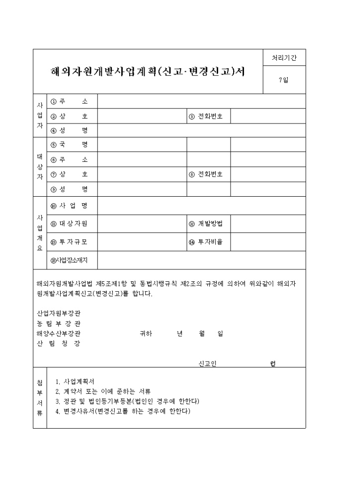 9,000원/월해외자원개발사업법 제5조제1항 및 동법시행규칙 제2조의 규정에 의하여 위와같이 해외 자원 개발 사업 계획신고(변경신고)를 하고자 할 때 사용하는 "해외 자원 개발 사업계획(신고,변경신고)서" 양식입니다.