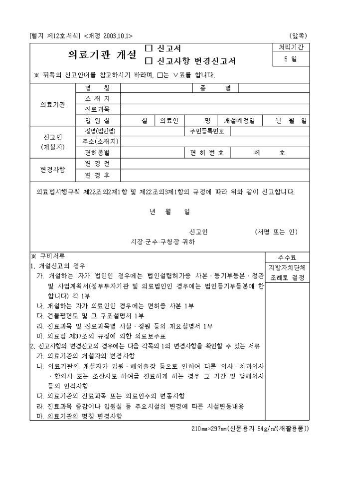 9,000원/월의료법시행규칙 제22조의2제1항 및 제22조의3제1항의 규정에 따라 의료기관 개설 신고서,신고사항 변경서 양식입니다.