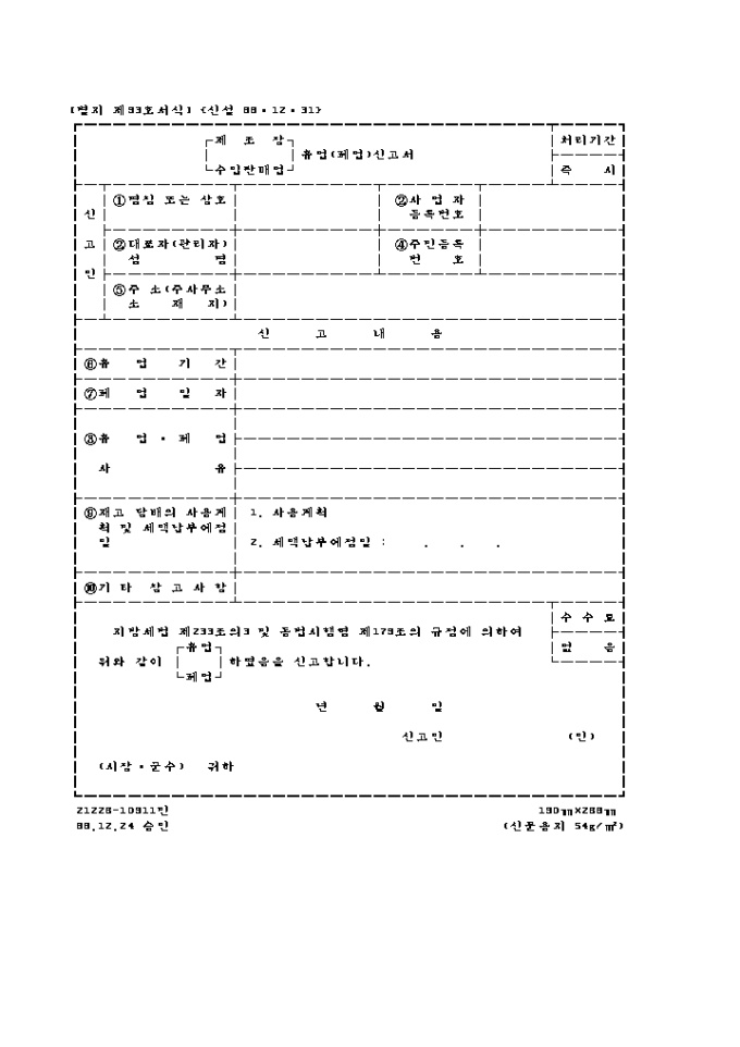 9,000원/월지방세법 제233조의3 및 동법시행령 제179조의 규정에 의하여 위와 같이 (휴업.폐업) 하였음을 신고할 때 사용하는 "(제조장, 수입판매업) (휴업,폐업)신고서" 양식입니다.