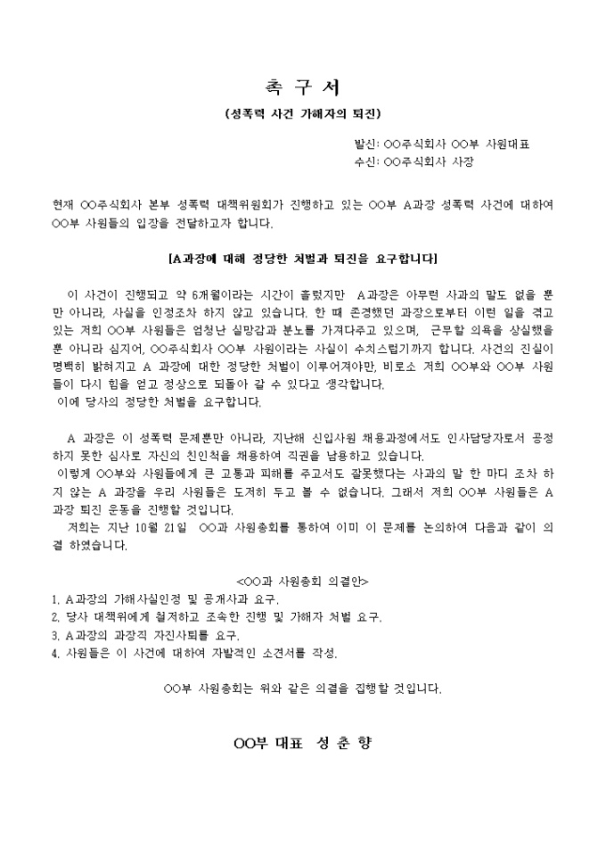 사내에서 일어나는 성폭력 사건에 대한 사원들의 입장을 전달하고, 가해자의 퇴진을 요구하는 촉구서 서식입니다.
