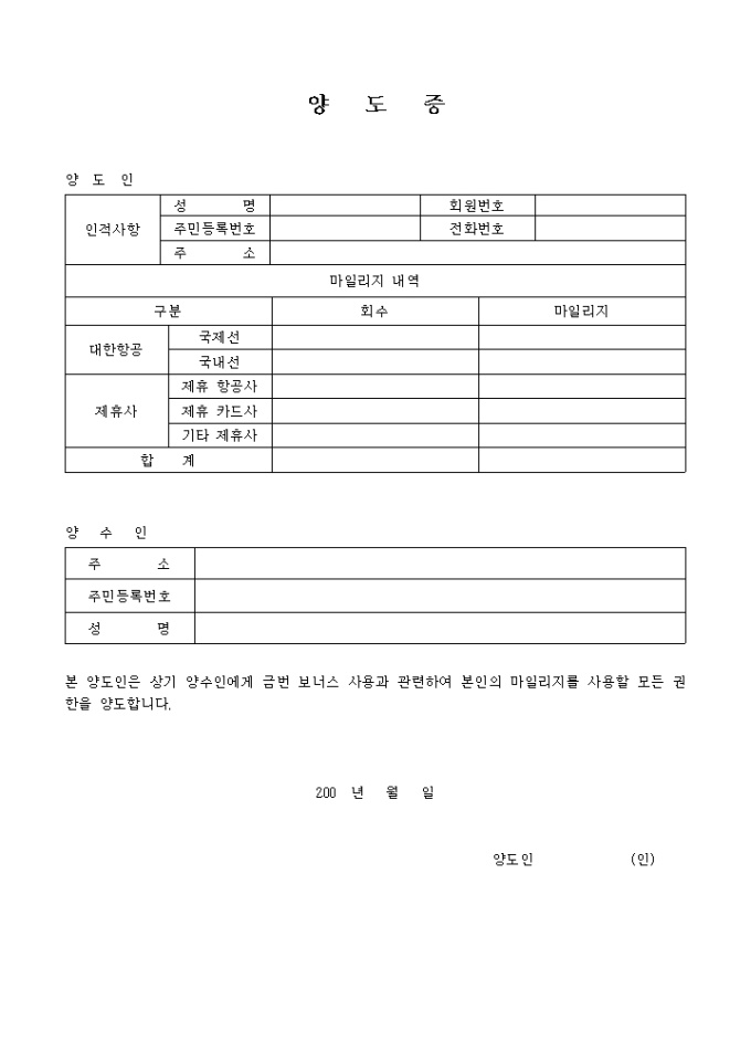 양도인, 양수인 인적사항과 마일리지 내역을 기록한 양도증(항공권마일리지)입니다.
